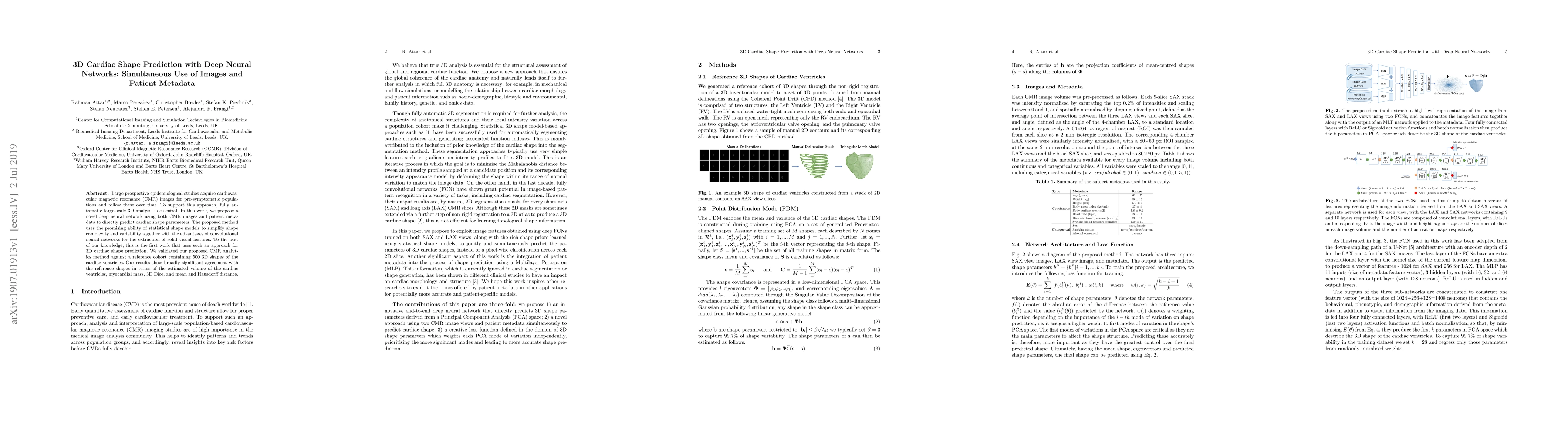This paper proposes a novel deep neural network that integrates cardiovascular magnetic resonance (CMR) images and patient metadata to predict 3D cardiac shape parameters. The method combines statistical shape models with convolutional neural networks, achieving significant agreement with reference cardiac shapes in terms of volume, mass, and spatial metrics.