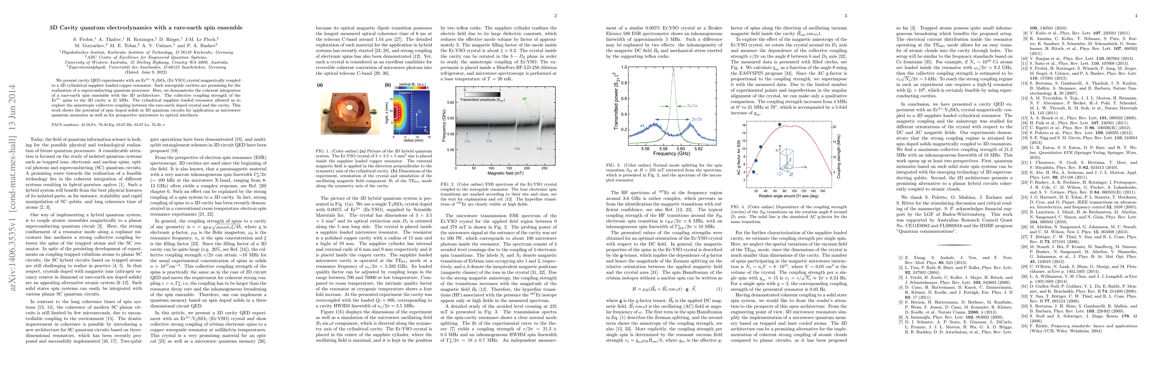 This paper details a cavity quantum electrodynamics experiment integrating an Er:YSO crystal with a 3D cylindrical sapphire resonator, achieving a 21 MHz collective coupling strength. The study highlights the potential of rare-earth spin ensembles in 3D quantum circuits for quantum memory and microwave-to-optical interfaces.