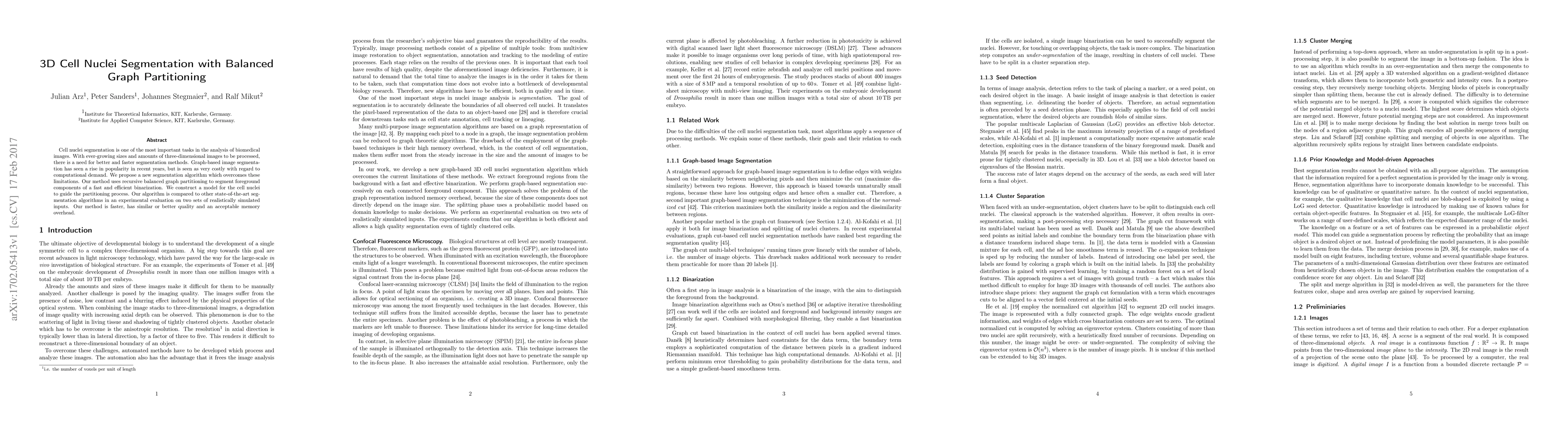 This paper proposes a new 3D cell nuclei segmentation algorithm using recursive balanced graph partitioning, which is faster and more efficient than existing methods, while maintaining similar or better segmentation quality. Experimental results show the method's effectiveness on simulated biomedical image data.