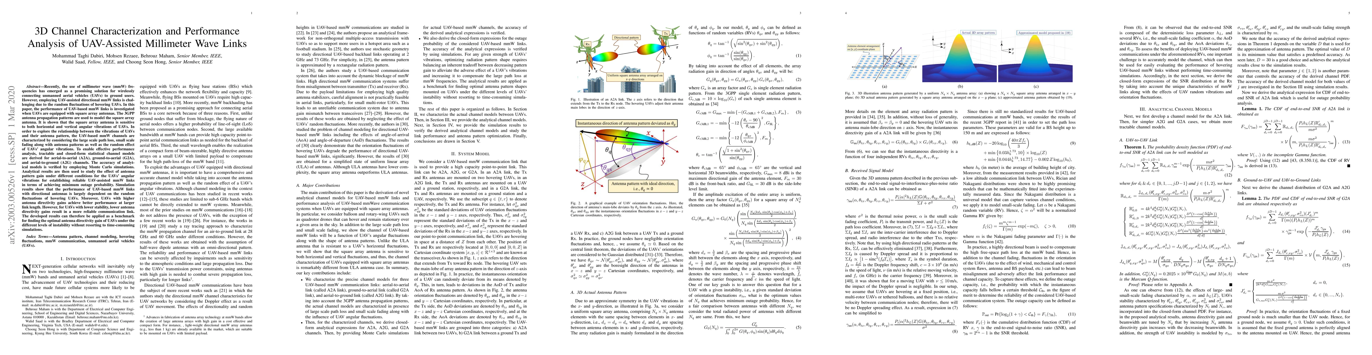 This paper investigates the performance of UAV-assisted millimeter wave (mmW) links using square array antennas, deriving closed-form statistical channel models for different communication scenarios. The study characterizes the impact of UAV angular vibrations on mmW channels and evaluates the minimum outage probability for reliable connections.