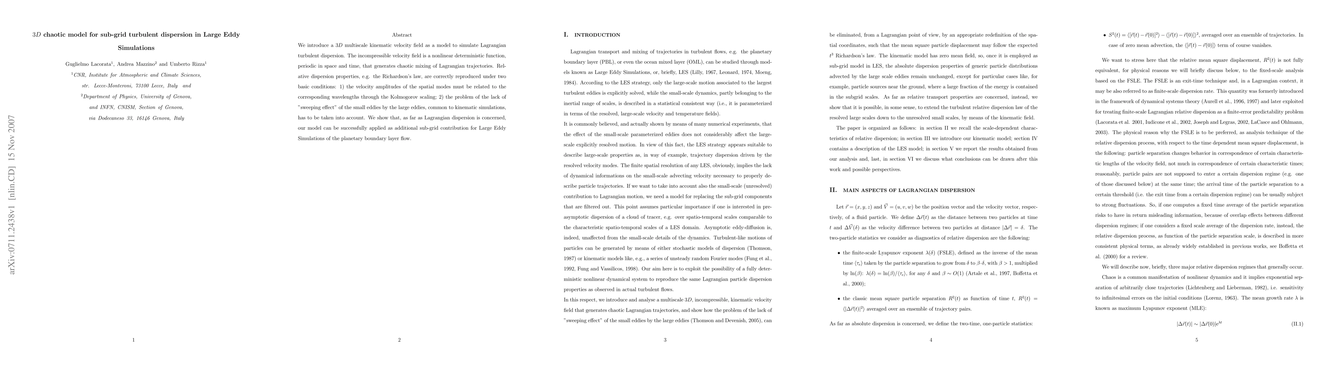 This paper introduces a 3D chaotic model for simulating Lagrangian turbulent dispersion in Large Eddy Simulations, ensuring correct reproduction of relative dispersion properties under specific conditions. The model addresses the issue of the "sweeping effect" in kinematic simulations and can be used as a sub-grid contribution for planetary boundary layer flow simulations.