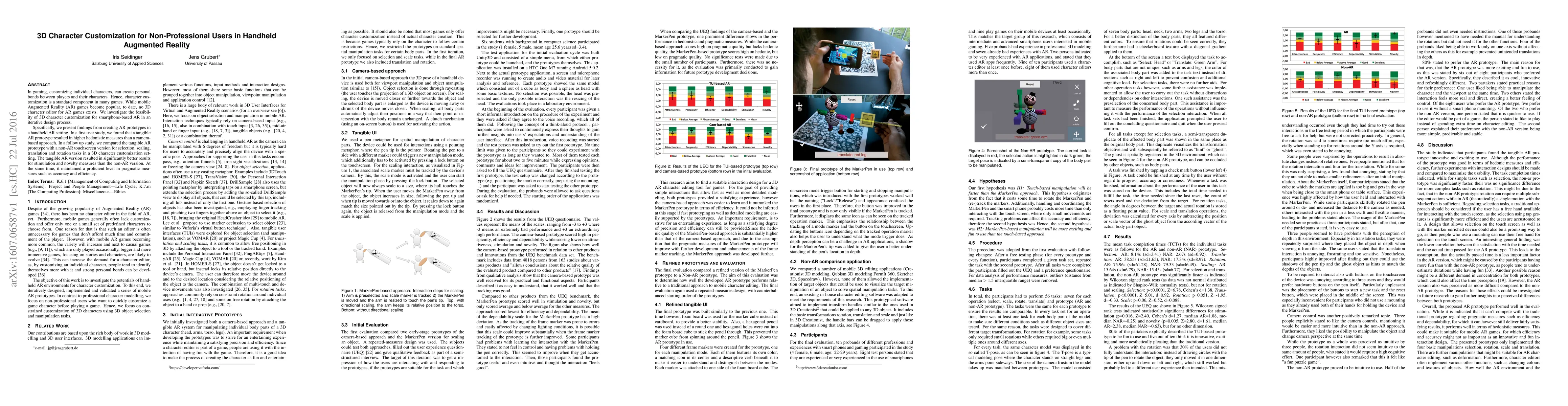 This research explores the feasibility of enabling non-professional users to customize 3D characters in handheld Augmented Reality (AR) gaming. Findings from iterative prototype development and user studies indicate that a tangible AR approach outperforms a camera-based and non-AR touchscreen methods in terms of stimulation, novelty, and maintains proficiency in accuracy and efficiency.