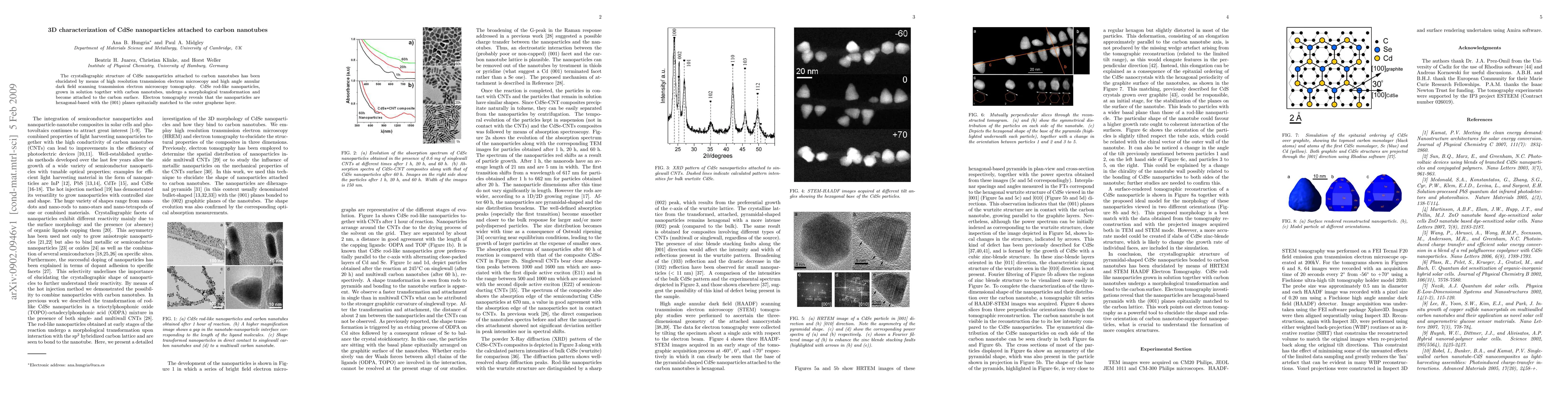 The crystallographic structure of CdSe nanoparticles attached to carbon nanotubes has been elucidated by means of high resolution transmission electron microscopy and high angle annular dark field scanning transmission electron microscopy tomography. CdSe rod-like nanoparticles, grown in solution together with carbon nanotubes, undergo a morphological transformation and become attached to the carbon surface. Electron tomography reveals that the nanoparticles are hexagonal-based with the (001) planes epitaxially matched to the outer graphene layer.