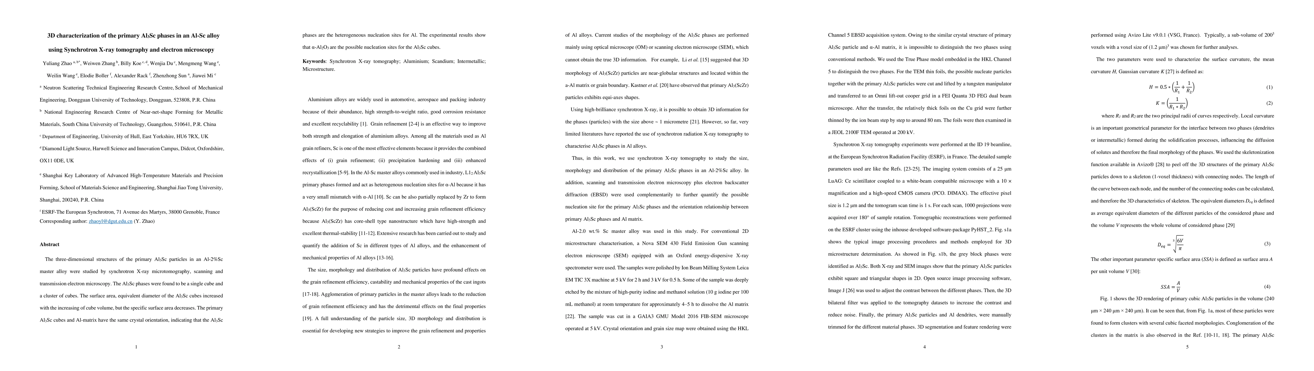 This study uses synchrotron X-ray tomography and electron microscopy to characterize the 3D structures of Al3Sc phases in an Al-2Sc alloy, revealing single cube and clustered cube formations. The specific surface area of Al3Sc decreases with increasing cube volume, and the phases serve as heterogeneous nucleation sites for Al, with α-Al2O3 potentially initiating their formation.
