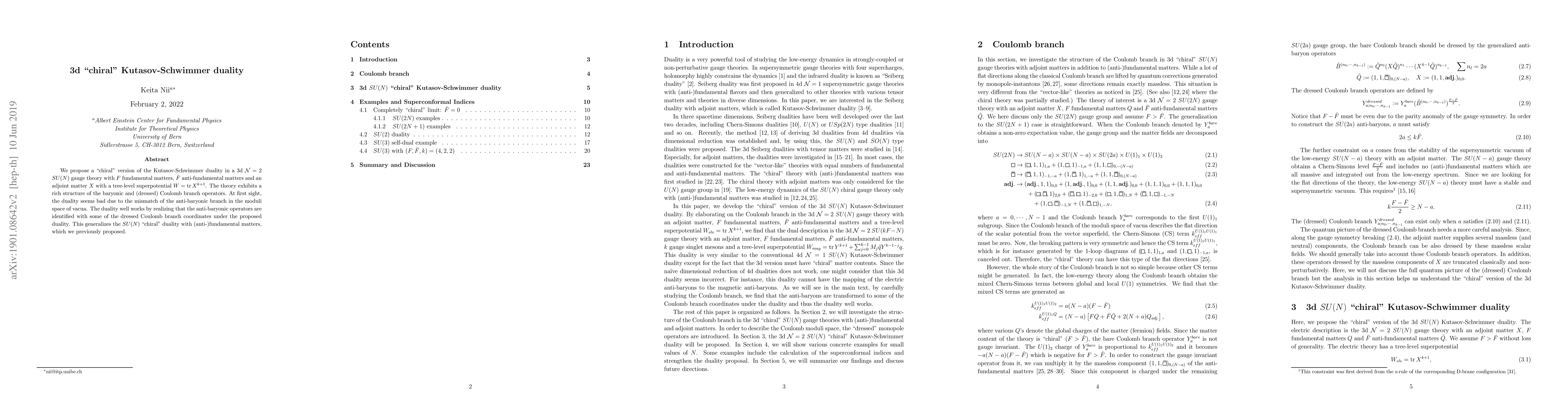 This paper introduces a "chiral" extension of the Kutasov-Schwimmer duality in a 3d $\mathcal{N}=2$ $SU(N)$ gauge theory, addressing a mismatch issue by identifying anti-baryonic operators with dressed Coulomb branch coordinates, thereby extending previous "chiral" dualities.
