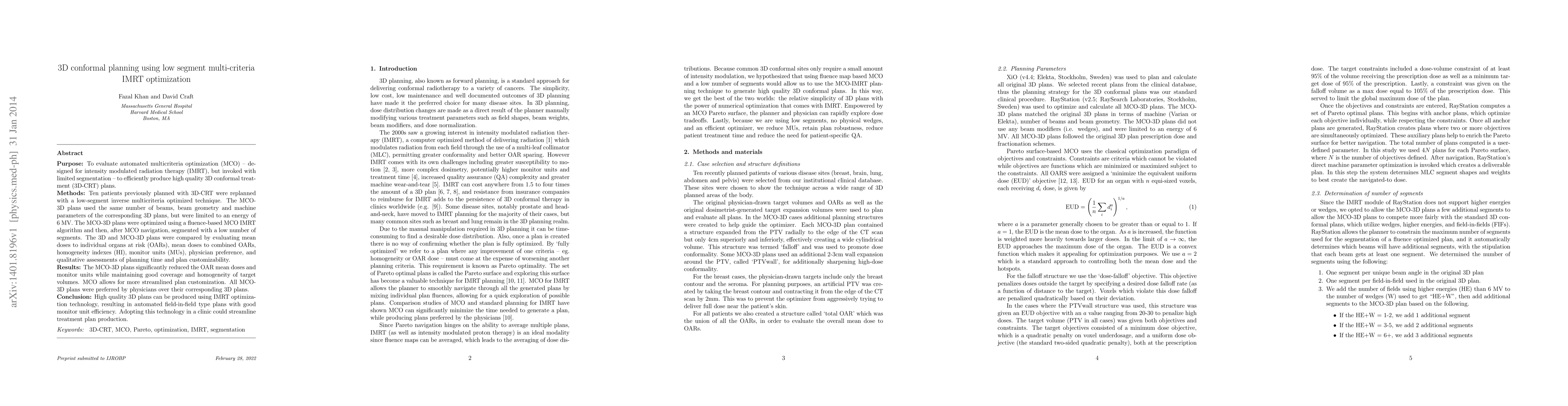 This study evaluates a low-segment multicriteria optimization technique for 3D conformal treatment plans in IMRT, demonstrating significant reductions in organ at risk doses and monitor units while maintaining target coverage. Physicians preferred these optimized plans over traditional 3D plans, suggesting potential for streamlined plan customization and efficient treatment planning.