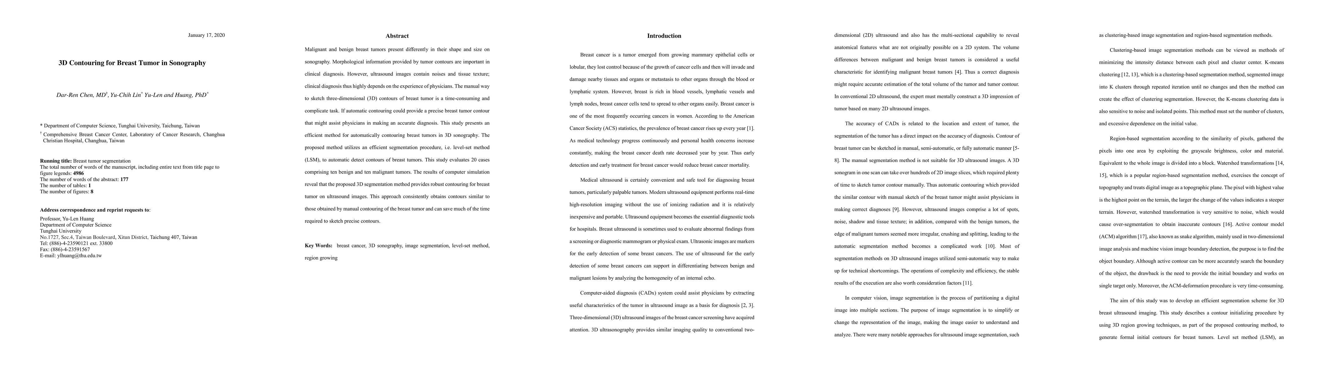 This study proposes an efficient automatic method for 3D contouring of breast tumors in sonography using a level-set segmentation procedure, aiming to assist physicians in accurate diagnosis and reduce the time-consuming manual contouring process. The method was evaluated on 20 cases, showing robust results comparable to manual contouring.