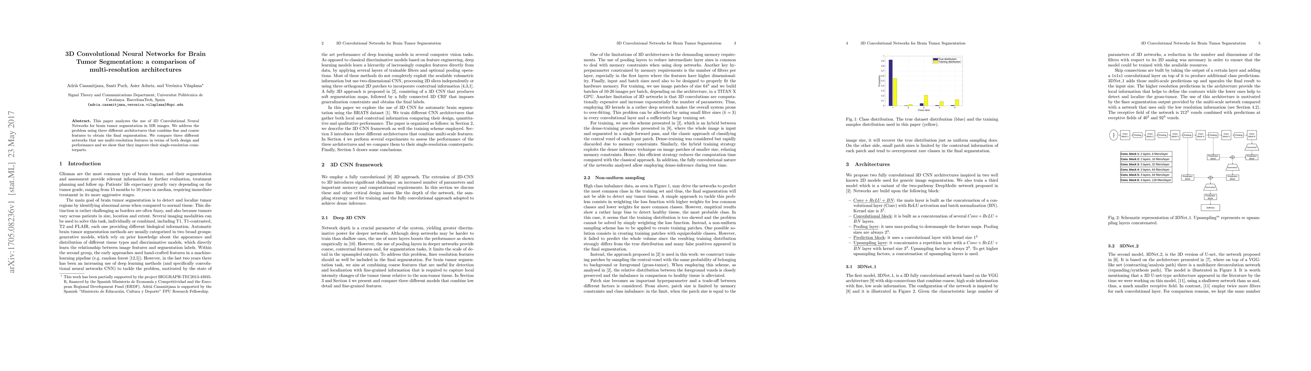 This paper evaluates 3D Convolutional Neural Networks for brain tumor segmentation in MR images, comparing three multi-resolution architectures for their design and performance. The results demonstrate that the multi-resolution networks outperform single-resolution models.