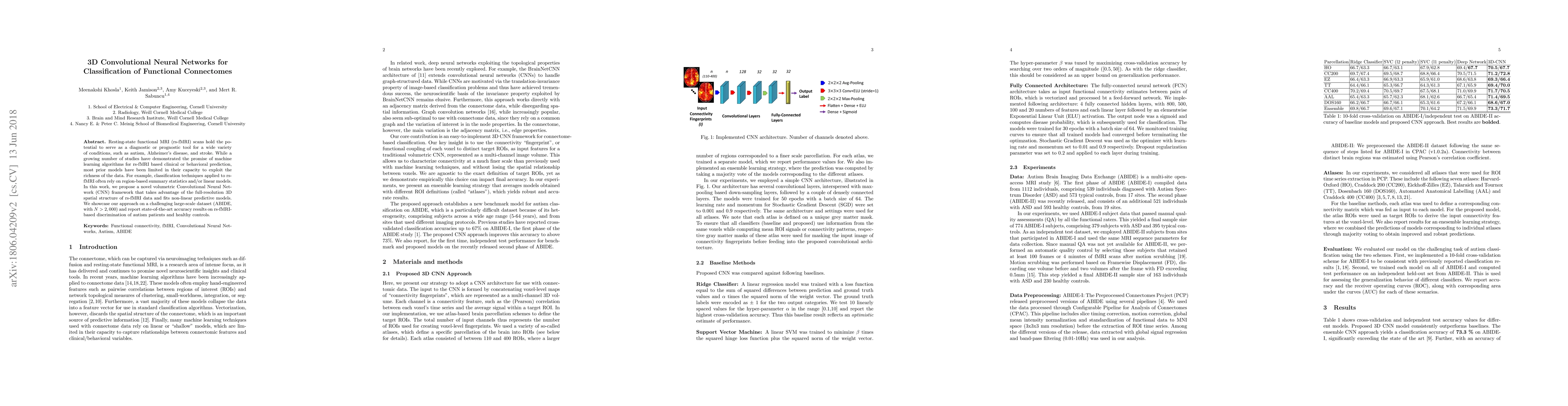 Resting-state functional MRI (rs-fMRI) scans hold the potential to serve as a diagnostic or prognostic tool for a wide variety of conditions, such as autism, Alzheimer's disease, and stroke. While a growing number of studies have demonstrated the promise of machine learning algorithms for rs-fMRI based clinical or behavioral prediction, most prior models have been limited in their capacity to exploit the richness of the data. For example, classification techniques applied to rs-fMRI often rely on region-based summary statistics and/or linear models. In this work, we propose a novel volumetric Convolutional Neural Network (CNN) framework that takes advantage of the full-resolution 3D spatial structure of rs-fMRI data and fits non-linear predictive models. We showcase our approach on a challenging large-scale dataset (ABIDE, with N > 2,000) and report state-of-the-art accuracy results on rs-fMRI-based discrimination of autism patients and healthy controls.