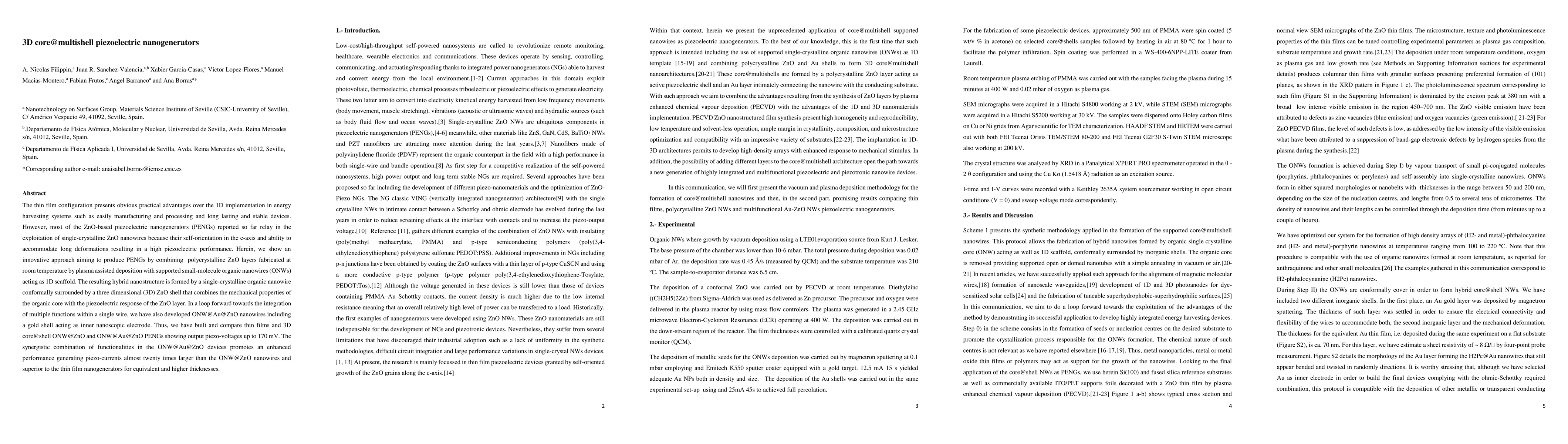 This paper presents a novel 3D core@multishell piezoelectric nanogenerator (PENG) combining polycrystalline ZnO layers with organic nanowires, achieving enhanced piezoelectric performance by integrating mechanical and electrical functionalities. The ONW@Au@ZnO nanowires show significantly higher piezo-currents compared to ONW@ZnO nanowires and thin film PENGs, demonstrating the potential for multifunctional nanogenerators.