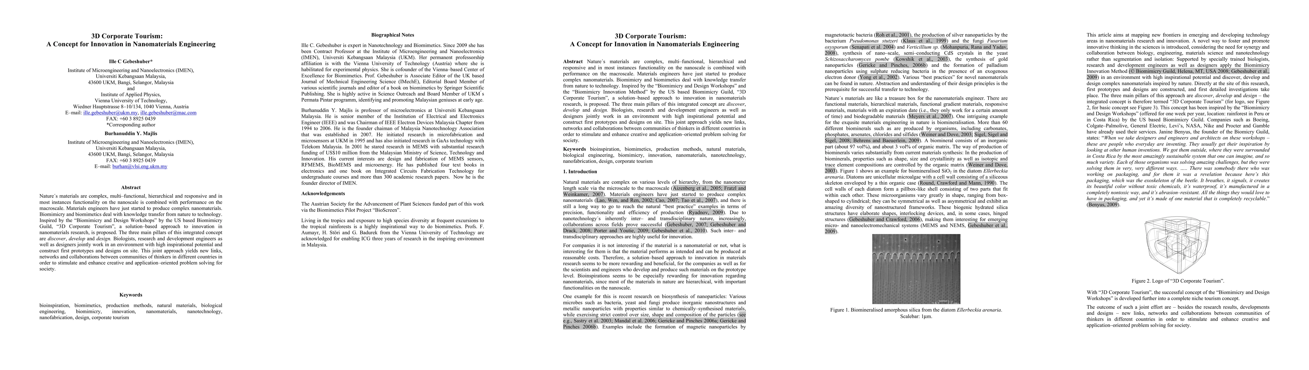 "3D Corporate Tourism" proposes an innovative approach to nanomaterials research, integrating biomimicry principles, where biologists, engineers, and designers collaborate to discover, develop, and design advanced materials, fostering international networks and creative problem-solving.