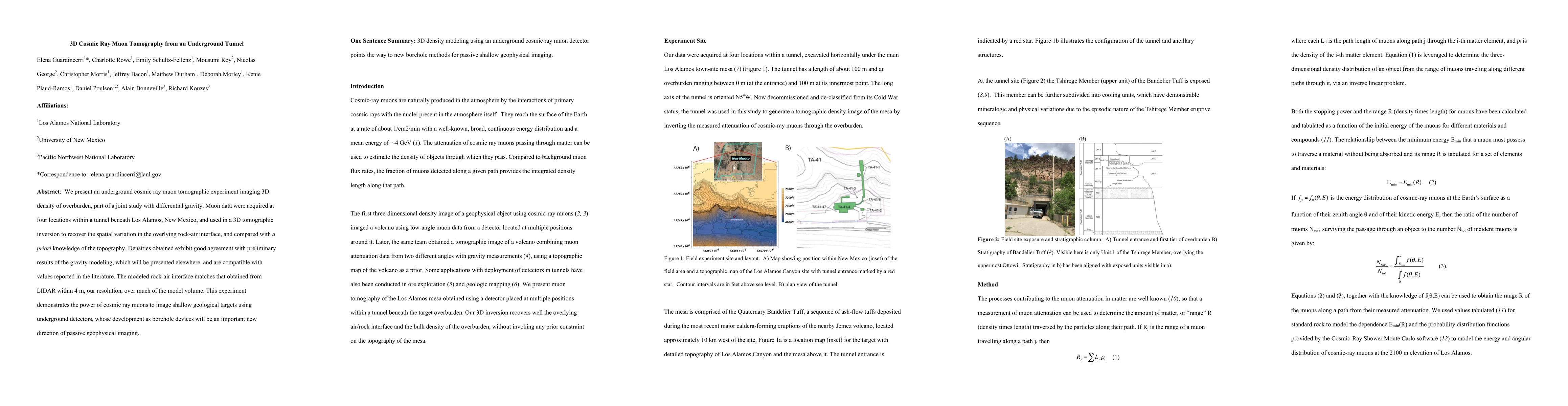 This paper details a 3D cosmic ray muon tomography experiment conducted in an underground tunnel in Los Alamos, New Mexico, to image the density of overburden. The results show good agreement with preliminary gravity modeling and match LIDAR topography data within 4 meters, demonstrating the potential of cosmic ray muons for shallow geological imaging.