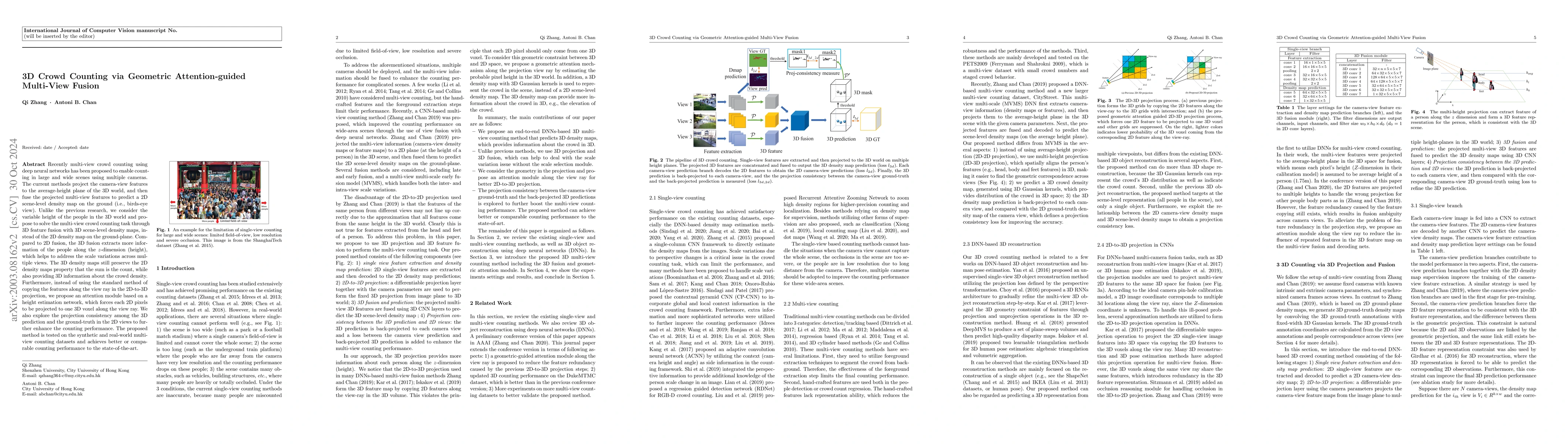 This paper proposes a novel 3D crowd counting method that uses 3D Gaussian kernels for multi-view fusion to generate 3D scene-level density maps, capturing height information to better handle scale variations across views. The method achieves better or comparable performance compared to 2D-based approaches on multi-view counting datasets.