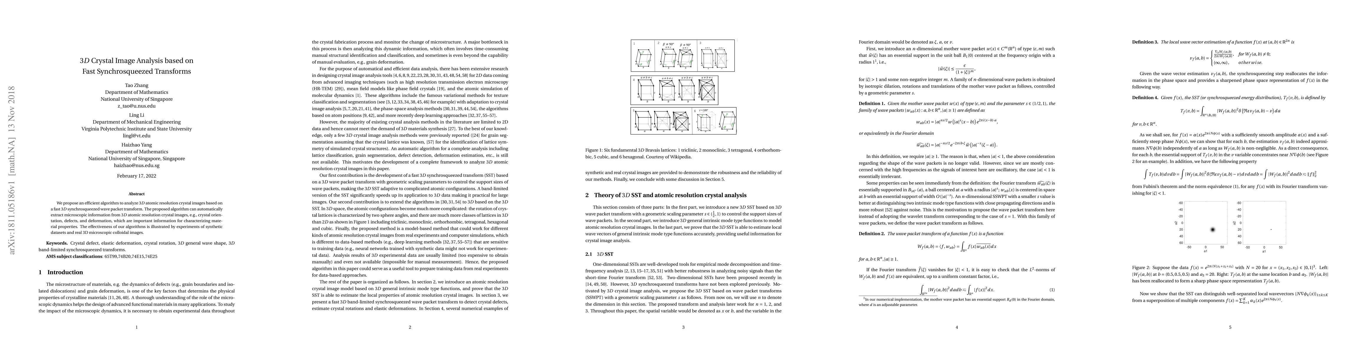 We propose an efficient algorithm to analyze $3D$ atomic resolution crystal images based on a fast $3D$ synchrosqueezed wave packet transform. The proposed algorithm can automatically extract microscopic information from $3D$ atomic resolution crystal images, e.g., crystal orientation, defects, and deformation, which are important information for characterizing material properties. The effectiveness of our algorithms is illustrated by experiments of synthetic datasets and real $3$D microscopic colloidal images.