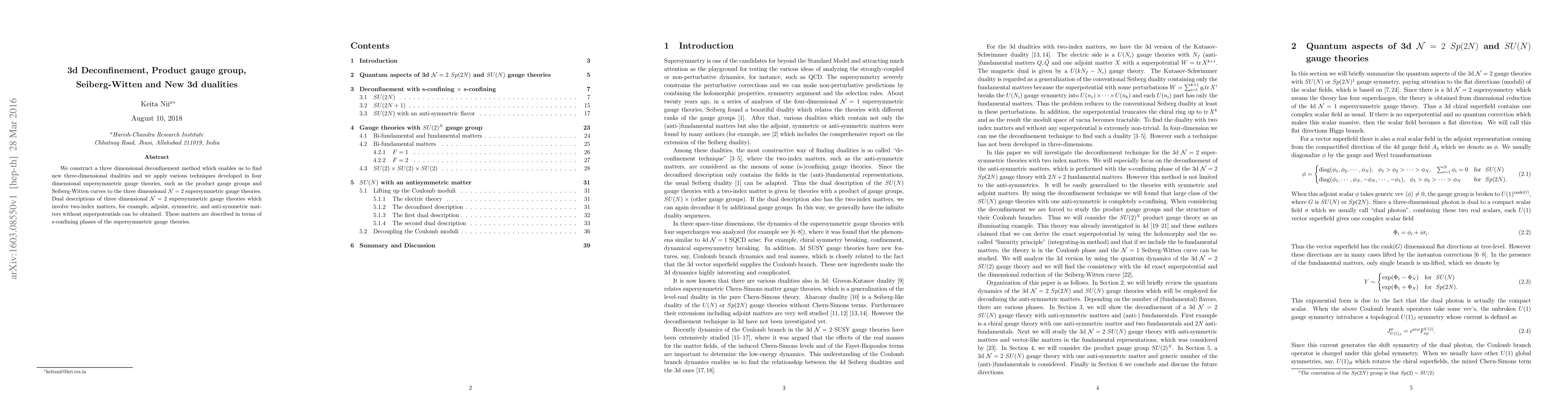 We construct a three dimensional deconfinement method which enables us to find new three-dimensional dualities and we apply various techniques developed in four dimensional supersymmetric gauge theories, such as the product gauge groups and Seiberg-Witten curves to the three dimensional $\mathcal{N}=2$ supersymmetric gauge theories. Dual descriptions of three dimensional $\mathcal{N}=2$ supersymmetric gauge theories which involve two-index matters, for example, adjoint, symmetric, and anti-symmetric matters without superpotentials can be obtained. These matters are described in terms of s-confining phases of the supersymmetric gauge theories.