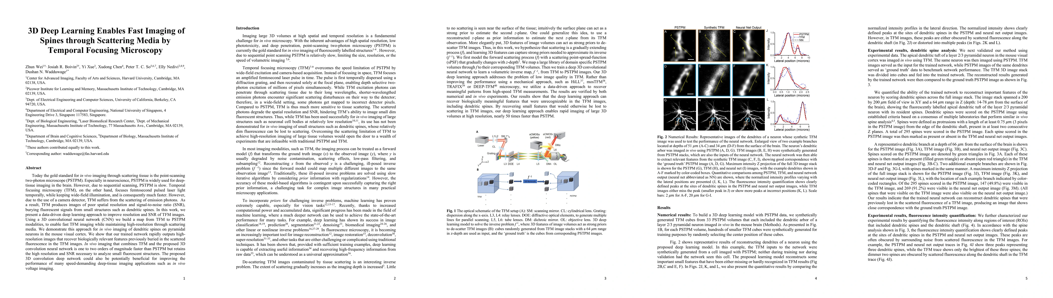 This research introduces a deep learning method using 3D convolutional neural networks to enhance temporal focusing microscopy (TFM) images, addressing their poor resolution and signal-to-noise ratio issues caused by scattering in deep-tissue imaging, particularly for visualizing small structures like dendritic spines in brain neurons. The method significantly speeds up imaging while preserving high resolution and SNR, making it potentially beneficial for various demanding deep-tissue imaging applications.