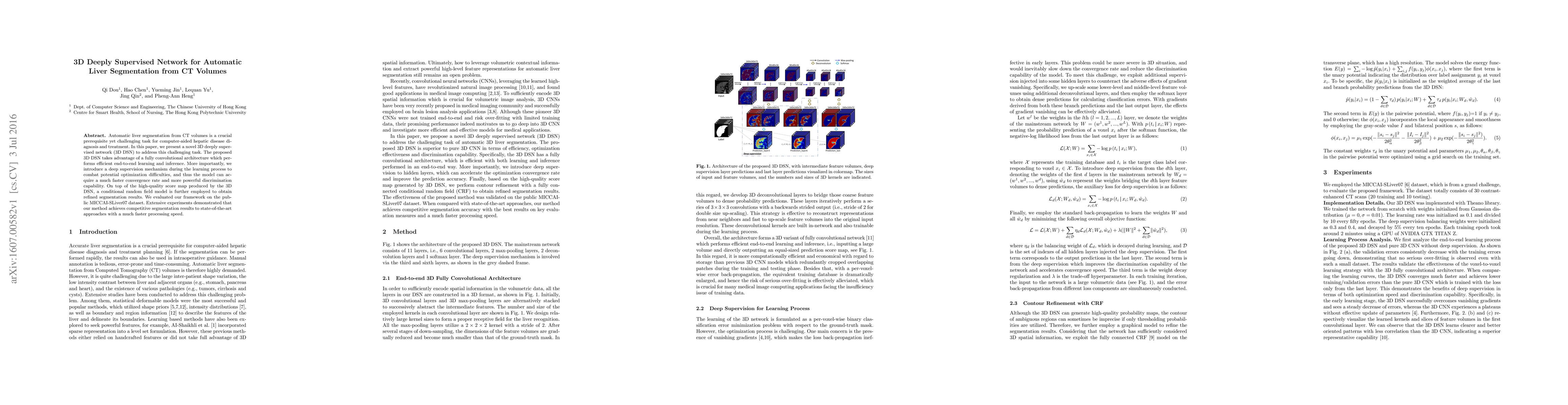 This paper introduces a 3D deeply supervised network (3D DSN) for automatic liver segmentation from CT volumes, leveraging a fully convolutional architecture for efficient learning and inference. The deep supervision mechanism enhances the model's convergence and discrimination, and a conditional random field model refines the segmentation results, achieving competitive accuracy and faster processing compared to state-of-the-art methods.
