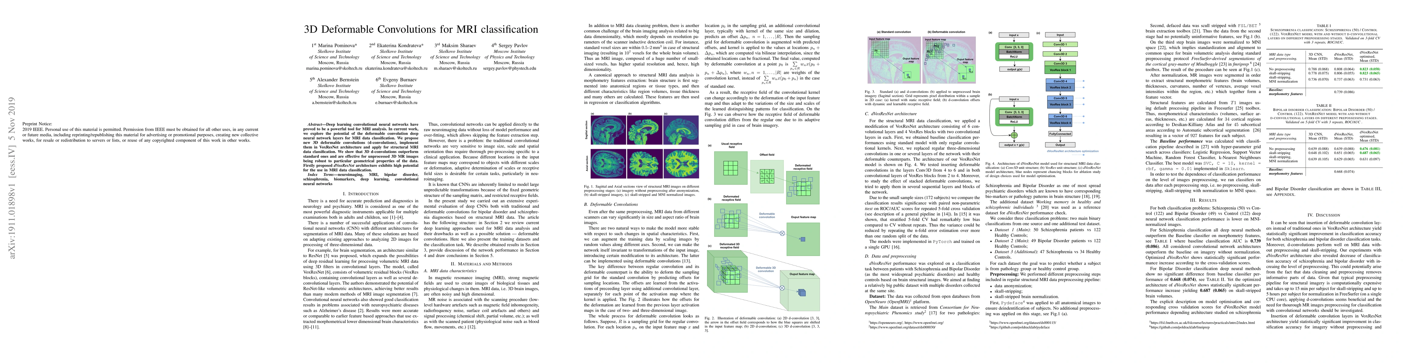 Deep learning convolutional neural networks have proved to be a powerful tool for MRI analysis. In current work, we explore the potential of the deformable convolutional deep neural network layers for MRI data classification. We propose new 3D deformable convolutions(d-convolutions), implement them in VoxResNet architecture and apply for structural MRI data classification. We show that 3D d-convolutions outperform standard ones and are effective for unprocessed 3D MR images being robust to particular geometrical properties of the data. Firstly proposed dVoxResNet architecture exhibits high potential for the use in MRI data classification.