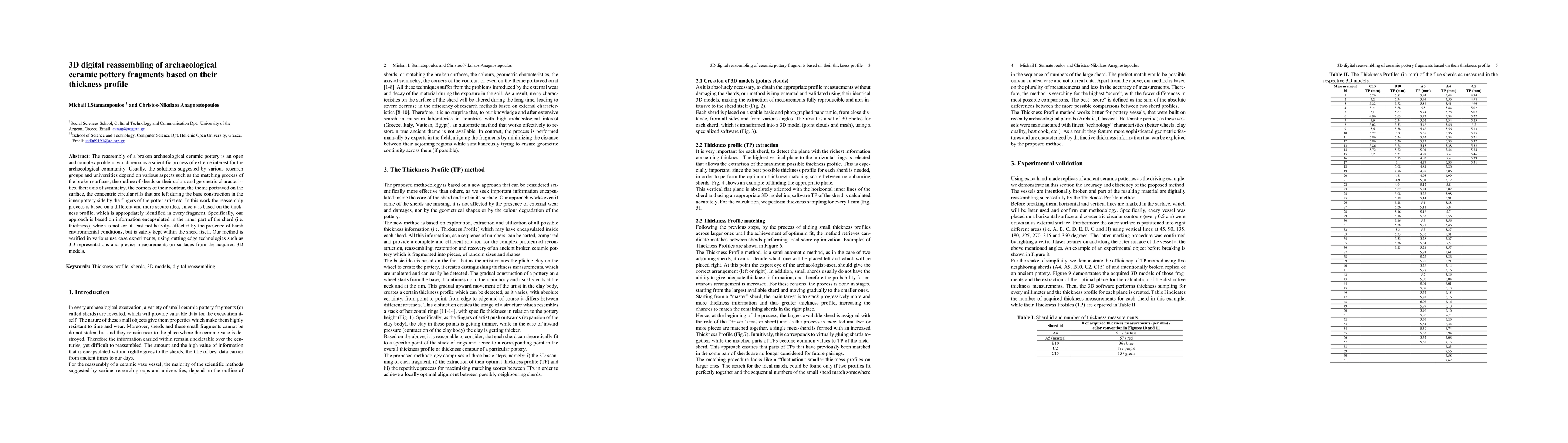 The reassembly of a broken archaeological ceramic pottery is an open and complex problem, which remains a scientific process of extreme interest for the archaeological community. Usually, the solutions suggested by various research groups and universities depend on various aspects such as the matching process of the broken surfaces, the outline of sherds or their colors and geometric characteris-tics, their axis of symmetry, the corners of their contour, the theme portrayed on the surface, the concentric circular rills that are left during the base construction in the inner pottery side by the fingers of the potter artist etc. In this work the reassembly process is based on a different and more secure idea, since it is based on the thick-ness profile, which is appropriately identified in every fragment. Specifically, our approach is based on information encapsulated in the inner part of the sherd (i.e. thickness), which is not -or at least not heavily- affected by the presence of harsh environmental conditions, but is safely kept within the sherd itself. Our method is verified in various use case experiments, using cutting edge technologies such as 3D representations and precise measurements on surfaces from the acquired 3D models.