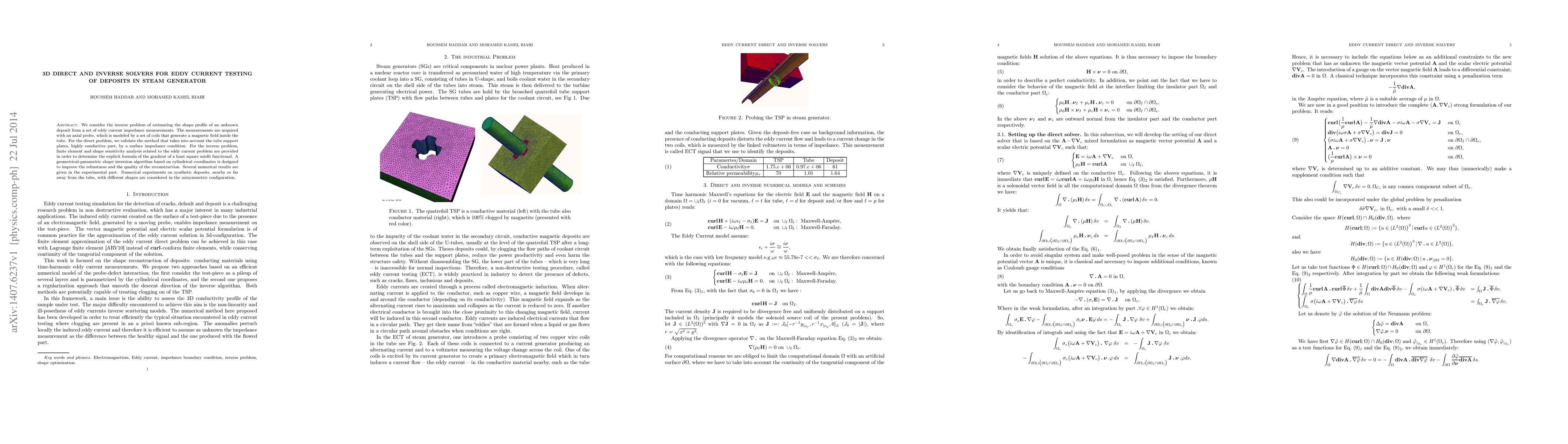 This paper presents methods for solving both direct and inverse problems in eddy current testing of deposits in steam generator tubes. It validates a direct solver considering tube support plates and develops an inverse solver using finite element analysis and shape sensitivity to reconstruct deposit shapes from impedance measurements.