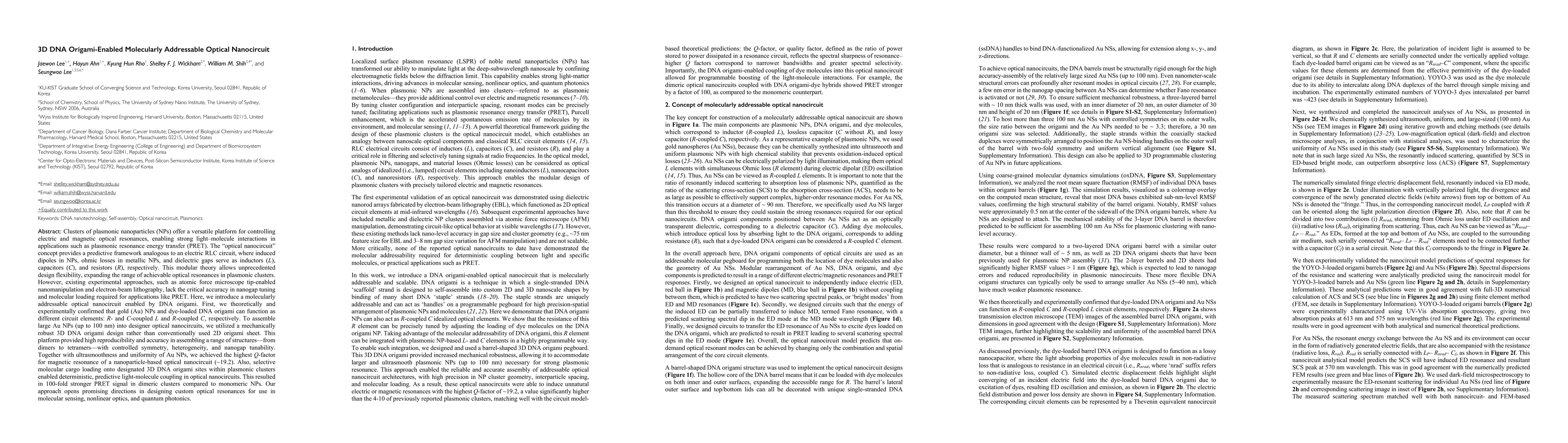The optical nanocircuit concept provides a predictive framework analogous to an electric RLC circuit, where induced dipoles in plasmonic nanoparticle (NPs), ohmic losses in NPs, and dielectric gaps serve as inductors (L), capacitors (C), and resistors (R), respectively. This modular theory allows unprecedented design flexibility, expanding the range of achievable optical resonances in plasmonic clusters. However, existing experimental approaches, such as atomic force microscope tip-enabled nanomanipulation and electron-beam lithography, lack the critical accuracy in nanogap tuning and molecular loading required for applications like PRET. Here, we introduce a molecularly addressable optical nanocircuit enabled by DNA origami. First, we theoretically and experimentally confirmed that gold (Au) NPs and dye-loaded DNA origami can function as different circuit elements: R- and C-coupled L and R-coupled C, respectively. To assemble large Au NPs into designer optical nanocircuits, we utilized a mechanically robust 3D DNA origami design rather than conventionally used 2D origami sheet. This platform provided high reproducibility and accuracy in assembling a range of structures-from dimers to tetramers-with controlled symmetry, heterogeneity, and nanogap tunability. Together with ultrasmoothness and uniformity of Au NPs, we achieved the highest Q-factor for magnetic resonance of a nanoparticle-based optical nanocircuit (~19.2). Also, selective molecular cargo loading onto designated 3D DNA origami sites within plasmonic clusters enabled deterministic, predictive light-molecule coupling in optical nanocircuits. This resulted in 100-fold stronger PRET signal in dimeric clusters compared to monomeric NPs. Our approach opens promising directions in designing custom optical resonances for use in molecular sensing, nonlinear optics, and quantum photonics.