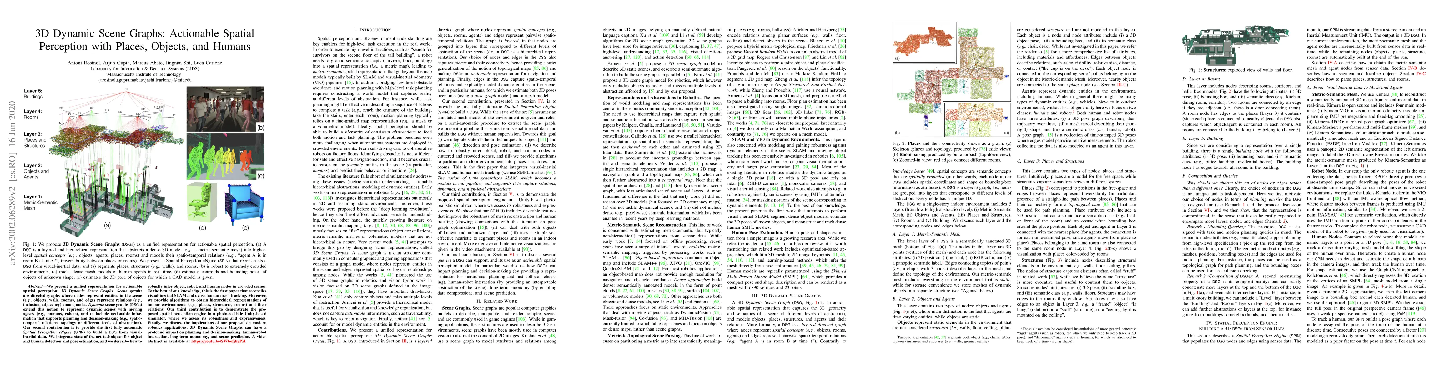 This paper introduces 3D Dynamic Scene Graphs (DSGs) for actionable spatial perception, integrating objects, places, and humans with dynamic relations and planning support. It presents a fully automatic Spatial PerceptIon eNgine (SPIN) to construct DSGs from visual-inertial data, combining SLAM and human tracking, and demonstrates its effectiveness in a Unity-based simulator.
