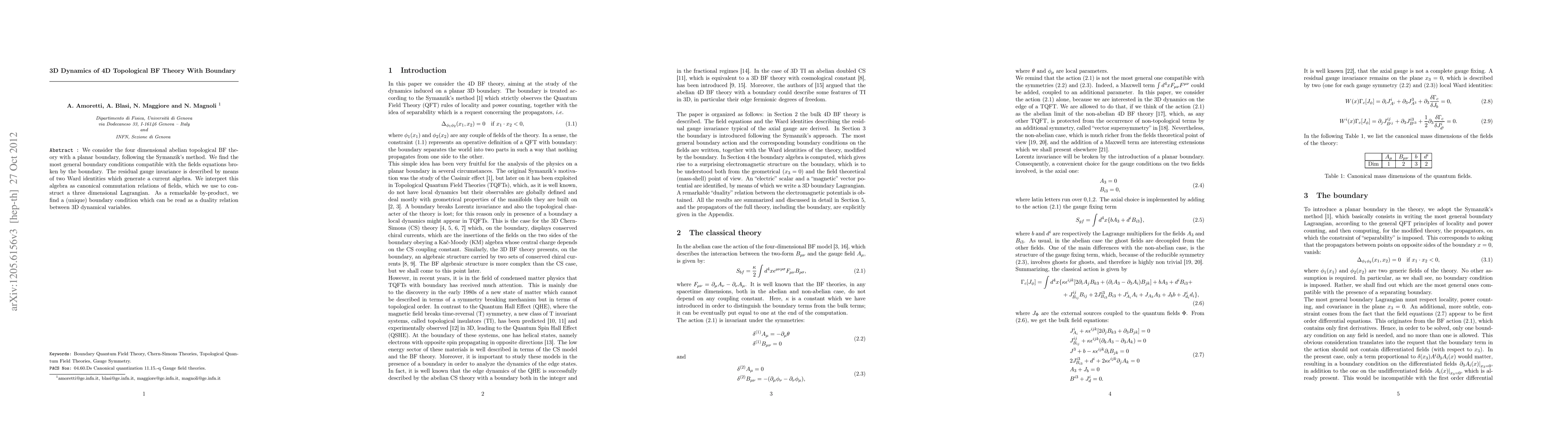 We consider the four dimensional abelian topological BF theory with a planar boundary introduced following the Symanzik's method. We find the most general boundary conditions compatible with the fields equations broken by the boundary. The residual gauge invariance is described by means of two Ward identities which generate an algebra of conserved currents. We interpret this algebra as canonical commutation relations of fields, which we use to construct a three dimensional Lagrangian. As a remarkable by-product, the (unique) boundary condition which we found, can be read as a duality relation between 3D dynamical variables.
