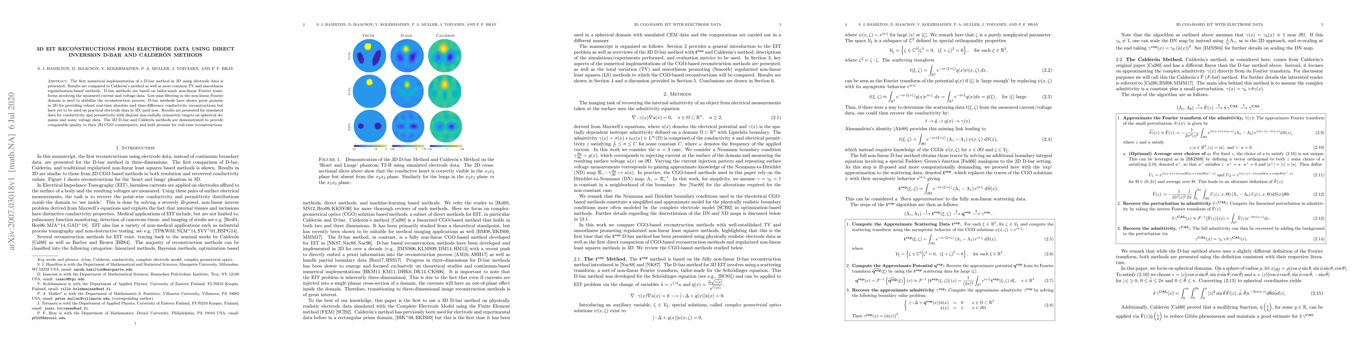 The first numerical implementation of a D-bar method in 3D using electrode data is presented. Results are compared to Calder\'on's method as well as more common TV and smoothness regularization-based methods. D-bar methods are based on tailor-made non-linear Fourier transforms involving the measured current and voltage data. Low-pass filtering in the non-linear Fourier domain is used to stabilize the reconstruction process. D-bar methods have shown great promise in 2D for providing robust real-time absolute and time-difference conductivity reconstructions but have yet to be used on practical electrode data in 3D, until now. Results are presented for simulated data for conductivity and permittivity with disjoint non-radially symmetric targets on spherical domains and noisy voltage data. The 3D D-bar and Calder\'on methods are demonstrated to provide comparable quality to their 2D CGO counterparts, and hold promise for real-time reconstructions.