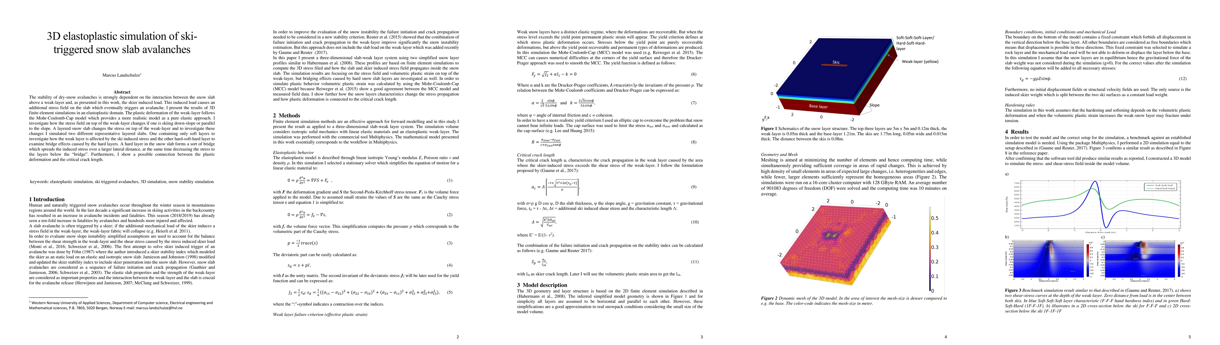 The stability of dry-snow avalanches is strongly dependent on the interaction between the snow slab above a weak-layer and, as presented in this work, the skier induced load. This induced load causes an additional stress field on the slab which eventually triggers an avalanche. I present the results of 3D finite element simulations in an elastoplastic domain. The plastic deformation of the weak-layer follows the Mohr-Coulomb-Cap model which provides a more realistic model as a pure elastic approach. I investigate how the stress field on top of the weak-layer changes if one is skiing down-slope or parallel to the slope. A layered snow slab changes the stress on top of the weak-layer and to investigate these changes I simulated two different representative layered slabs. One containing only soft layers to investigate how the weak layer is affected by the ski induced stress and the other hard-soft-hard layer to examine bridge effects caused by the hard layers. A hard layer in the snow slab forms a sort of bridge which spreads the induced stress over a larger lateral distance, at the same time decreasing the stress to the layers below the bridge. Furthermore, I show a possible connection between the plastic deformation and the critical crack length.