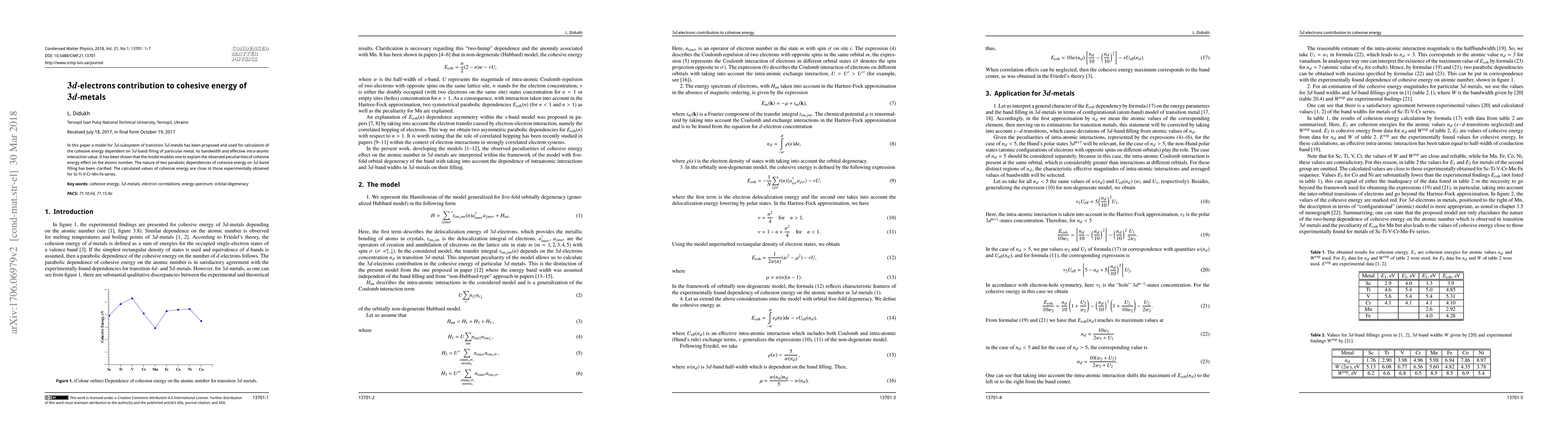 In this paper a model for $3d$-subsystem of transition $3d$-metals has been proposed and used for calculation of the cohesive energy dependent on $3d$-band filling of particular metal, its bandwidth and effective intra-atomic interaction value. It has been shown that the model enables one to explain the observed peculiarities of cohesive energy effect on the atomic number. The nature of two parabolic dependencies of cohesive energy on $3d$-band filling has been clarified. The calculated values of cohesive energy are close to those experimentally obtained for Sc-Ti-V-Cr-Mn-Fe series.