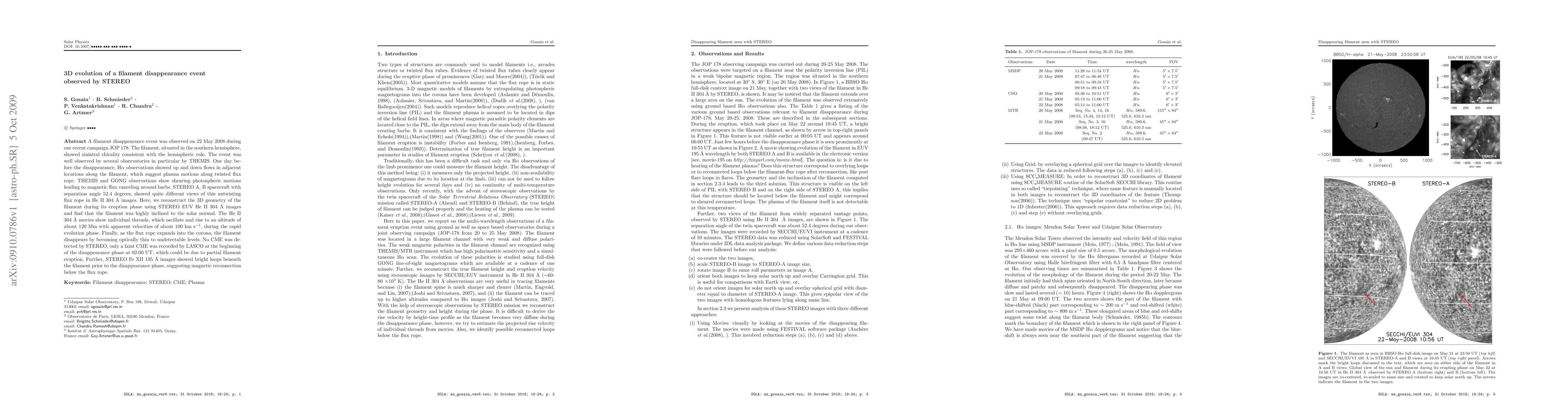 A filament disappearance event was observed on 22 May 2008 during our recent campaign JOP 178. The filament, situated in the southern hemisphere, showed sinistral chirality consistent with the hemispheric rule. The event was well observed by several observatories in particular by THEMIS. One day before the disappearance, H$\alpha$ observations showed up and down flows in adjacent locations along the filament, which suggest plasma motions along twisted flux rope. THEMIS and GONG observations show shearing photospheric motions leading to magnetic flux canceling around barbs. STEREO A, B spacecraft with separation angle 52.4 degrees, showed quite different views of this untwisting flux rope in He II 304 \AA\ images. Here, we reconstruct the 3D geometry of the filament during its eruption phase using STEREO EUV He II 304 \AA\ images and find that the filament was highly inclined to the solar normal. The He II 304 \AA\ movies show individual threads, which oscillate and rise to an altitude of about 120 Mm with apparent velocities of about 100 km s$^{-1}$, during the rapid evolution phase. Finally, as the flux rope expands into the corona, the filament disappears by becoming optically thin to undetectable levels. No CME was detected by STEREO, only a faint CME was recorded by LASCO at the beginning of the disappearance phase at 02:00 UT, which could be due to partial filament eruption. Further, STEREO Fe XII 195 \AA\ images showed bright loops beneath the filament prior to the disappearance phase, suggesting magnetic reconnection below the flux rope.