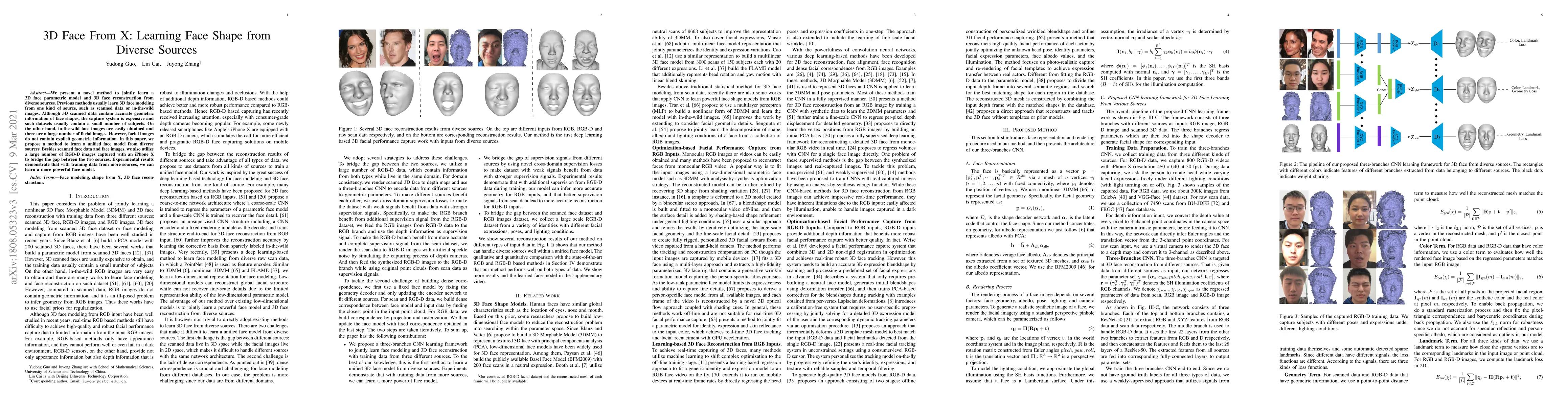We present a novel method to jointly learn a 3D face parametric model and 3D face reconstruction from diverse sources. Previous methods usually learn 3D face modeling from one kind of source, such as scanned data or in-the-wild images. Although 3D scanned data contain accurate geometric information of face shapes, the capture system is expensive and such datasets usually contain a small number of subjects. On the other hand, in-the-wild face images are easily obtained and there are a large number of facial images. However, facial images do not contain explicit geometric information. In this paper, we propose a method to learn a unified face model from diverse sources. Besides scanned face data and face images, we also utilize a large number of RGB-D images captured with an iPhone X to bridge the gap between the two sources. Experimental results demonstrate that with training data from more sources, we can learn a more powerful face model.