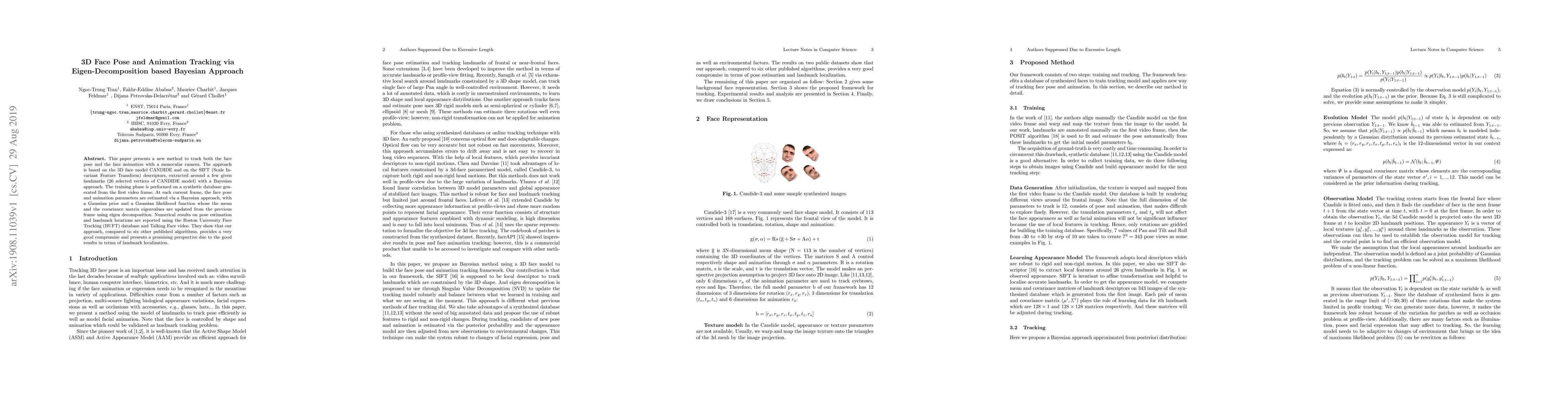 This paper introduces a novel method for tracking 3D face pose and animation using a monocular camera, leveraging a Bayesian approach with eigen-decomposition for updating parameters, and demonstrates superior performance in pose estimation and landmark localization compared to other algorithms.