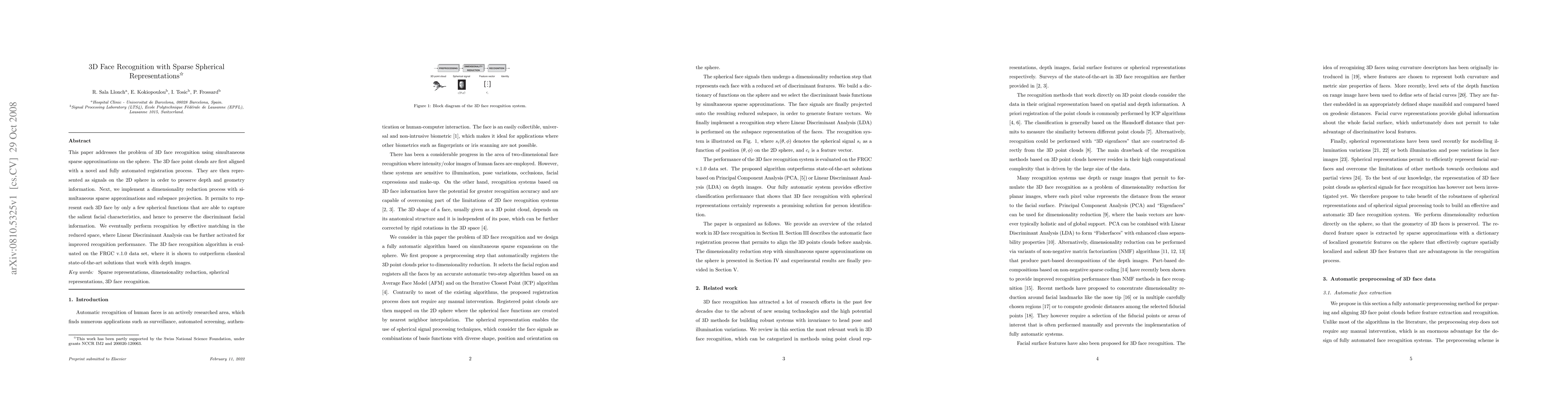 This paper proposes a 3D face recognition method using sparse spherical representations, aligning 3D face point clouds and reducing dimensionality through sparse approximations and subspace projection. The approach outperforms traditional methods on the FRGC v.1.0 dataset.