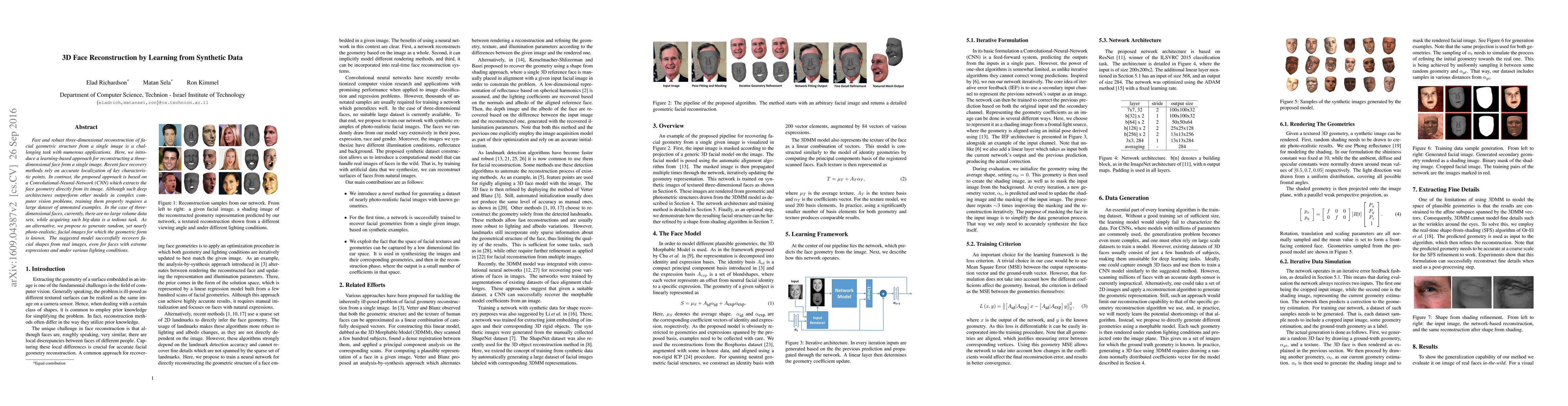 Fast and robust three-dimensional reconstruction of facial geometric structure from a single image is a challenging task with numerous applications. Here, we introduce a learning-based approach for reconstructing a three-dimensional face from a single image. Recent face recovery methods rely on accurate localization of key characteristic points. In contrast, the proposed approach is based on a Convolutional-Neural-Network (CNN) which extracts the face geometry directly from its image. Although such deep architectures outperform other models in complex computer vision problems, training them properly requires a large dataset of annotated examples. In the case of three-dimensional faces, currently, there are no large volume data sets, while acquiring such big-data is a tedious task. As an alternative, we propose to generate random, yet nearly photo-realistic, facial images for which the geometric form is known. The suggested model successfully recovers facial shapes from real images, even for faces with extreme expressions and under various lighting conditions.