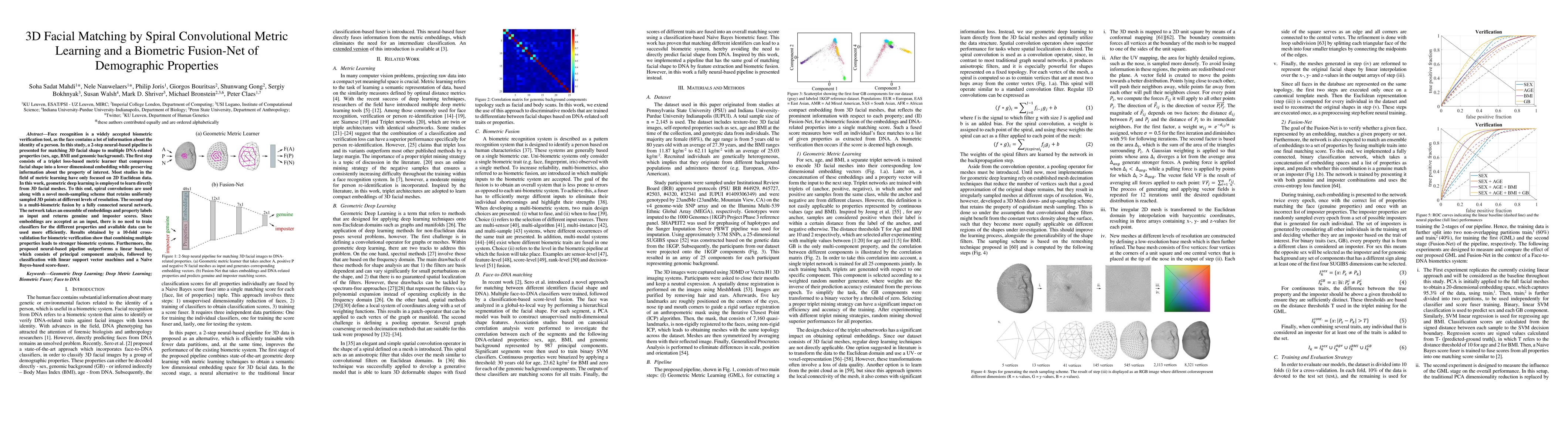 This paper proposes a 2-step neural-based pipeline for matching 3D facial shape to demographic properties using spiral convolutional metric learning and a fusion-net. The method outperforms traditional linear baselines in biometric verification by combining multiple properties.