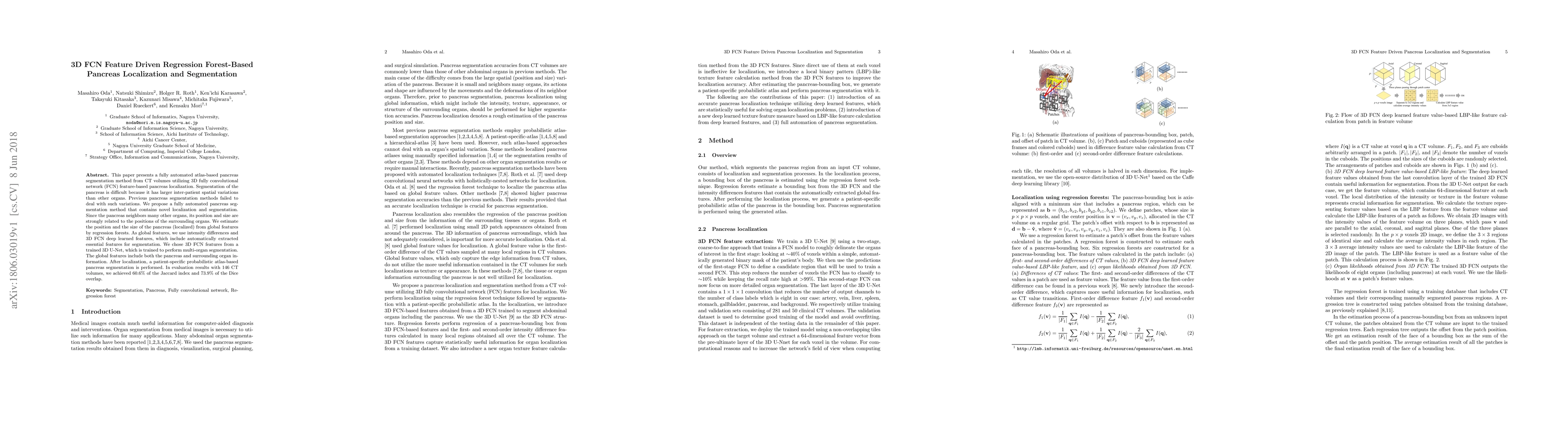This paper introduces a fully automated method for pancreas segmentation using 3D FCN feature-based localization and regression forests to handle spatial variations. The method achieved 60.6% Jaccard index and 73.9% Dice overlap in segmentation accuracy on 146 CT volumes.