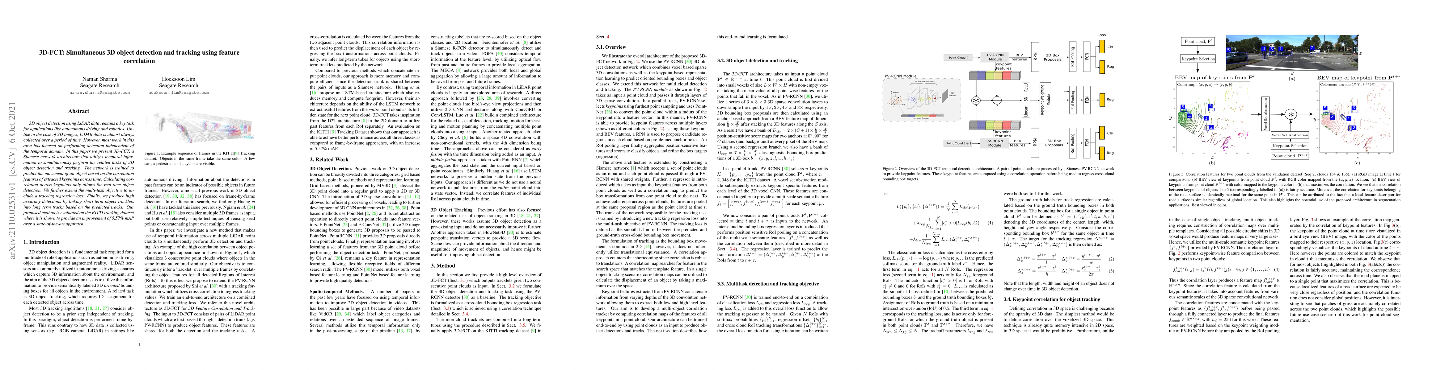 The paper introduces 3D-FCT, a Siamese network leveraging temporal information for simultaneous 3D object detection and tracking using LiDAR data. It predicts object movement via correlation features of keypoints across time, achieving real-time performance and improved accuracy over state-of-the-art methods on the KITTI dataset.
