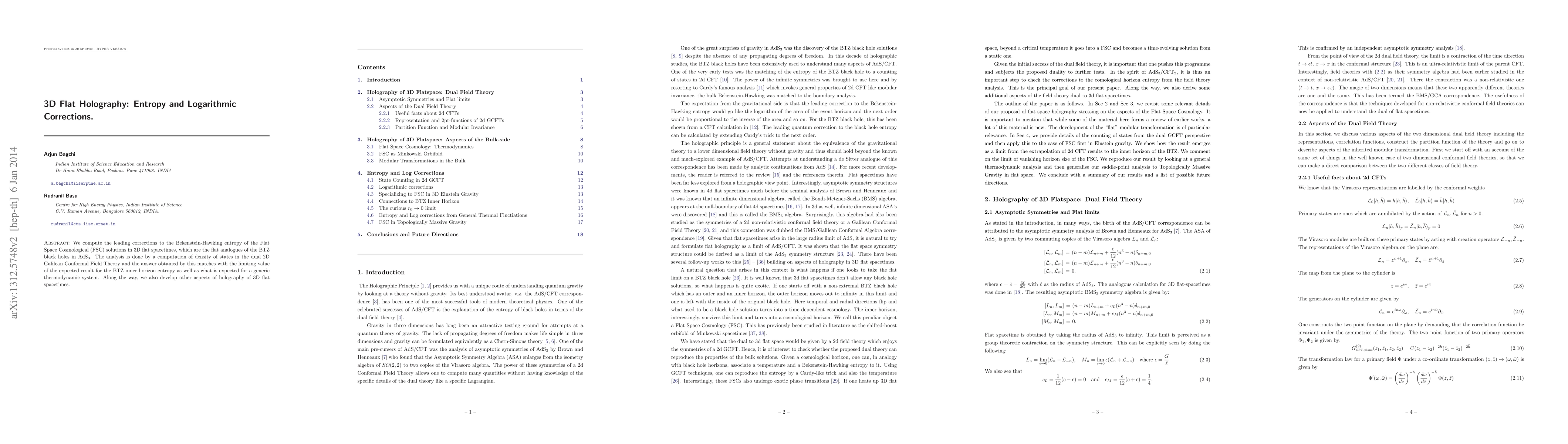 This paper calculates the leading corrections to the Bekenstein-Hawking entropy for 3D flat space cosmological solutions, analogous to BTZ black holes, using the density of states in a dual 2D Galilean Conformal Field Theory, confirming consistency with BTZ inner horizon entropy and generic thermodynamic systems. It also explores additional holographic aspects of 3D flat spacetimes.