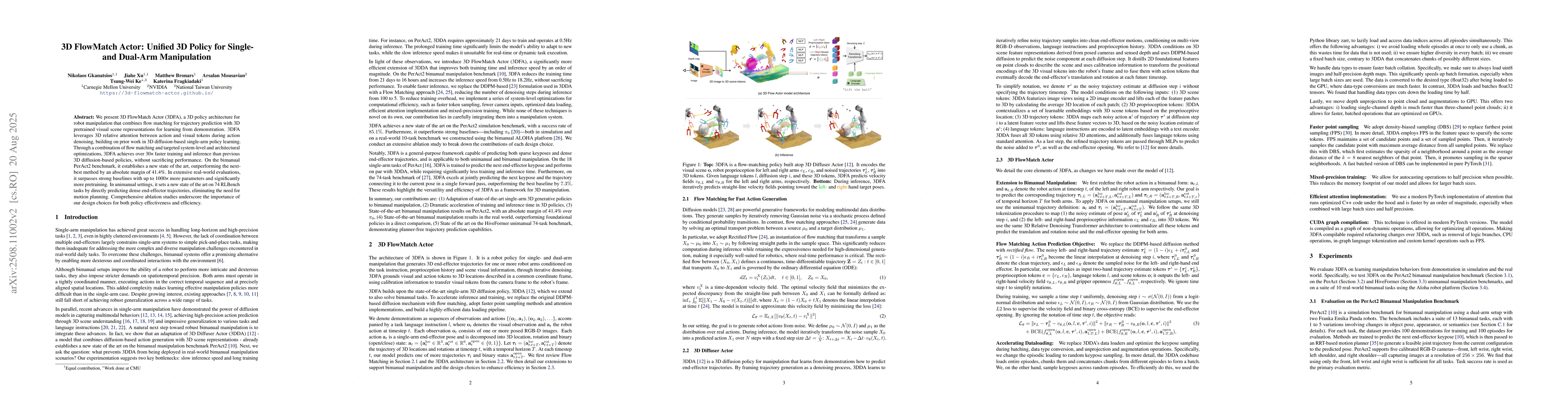 We present 3D FlowMatch Actor (3DFA), a 3D policy architecture for robot manipulation that combines flow matching for trajectory prediction with 3D pretrained visual scene representations for learning from demonstration. 3DFA leverages 3D relative attention between action and visual tokens during action denoising, building on prior work in 3D diffusion-based single-arm policy learning. Through a combination of flow matching and targeted system-level and architectural optimizations, 3DFA achieves over 30x faster training and inference than previous 3D diffusion-based policies, without sacrificing performance. On the bimanual PerAct2 benchmark, it establishes a new state of the art, outperforming the next-best method by an absolute margin of 41.4%. In extensive real-world evaluations, it surpasses strong baselines with up to 1000x more parameters and significantly more pretraining. In unimanual settings, it sets a new state of the art on 74 RLBench tasks by directly predicting dense end-effector trajectories, eliminating the need for motion planning. Comprehensive ablation studies underscore the importance of our design choices for both policy effectiveness and efficiency.