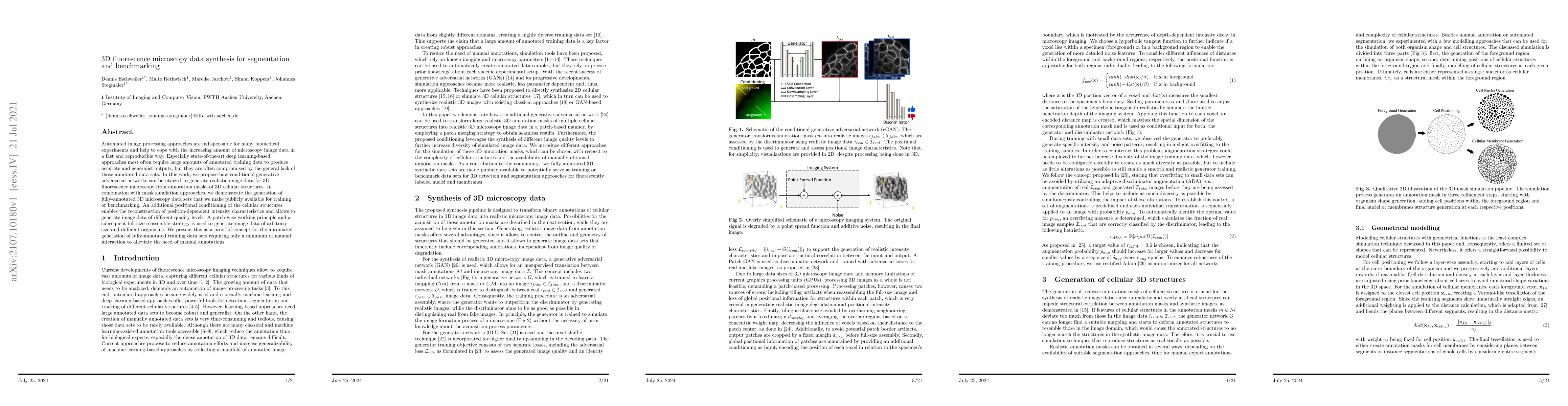This paper proposes using conditional generative adversarial networks to synthesize realistic 3D fluorescence microscopy data from cellular structure masks, enabling the creation of fully-annotated datasets for training and benchmarking deep learning models. The approach also allows for generating data of varying quality and size, demonstrating a proof-of-concept for reducing the need for extensive manual annotations.