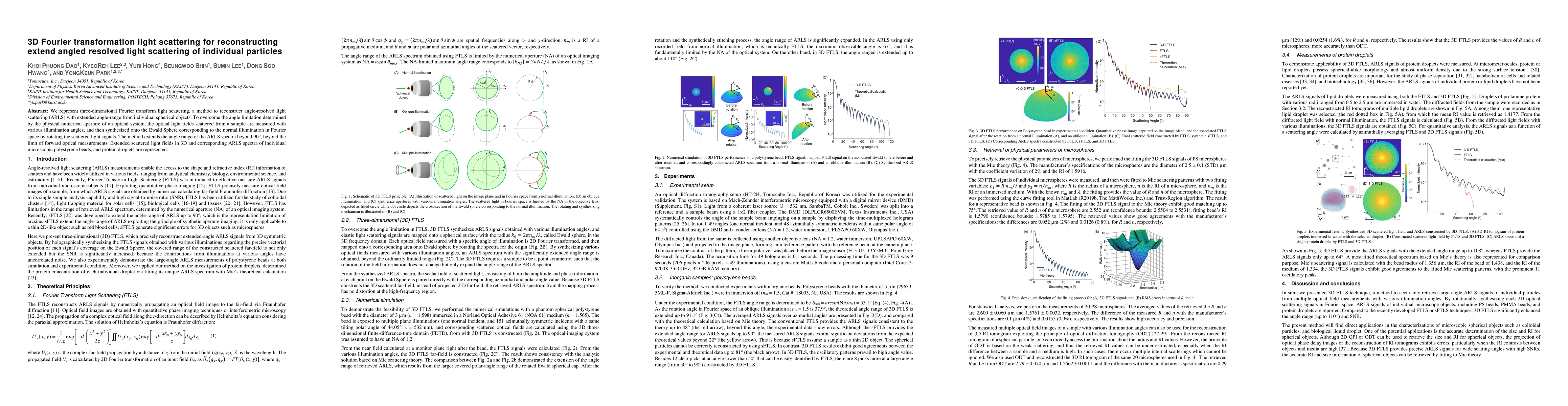 This paper introduces a 3D Fourier transform light scattering technique to reconstruct angle-resolved light scattering (ARLS) spectra from individual particles over an extended angle range beyond 90 degrees, overcoming the limitations of traditional optical systems. The method synthesizes scattered light fields from various illumination angles onto the Ewald Sphere in Fourier space.