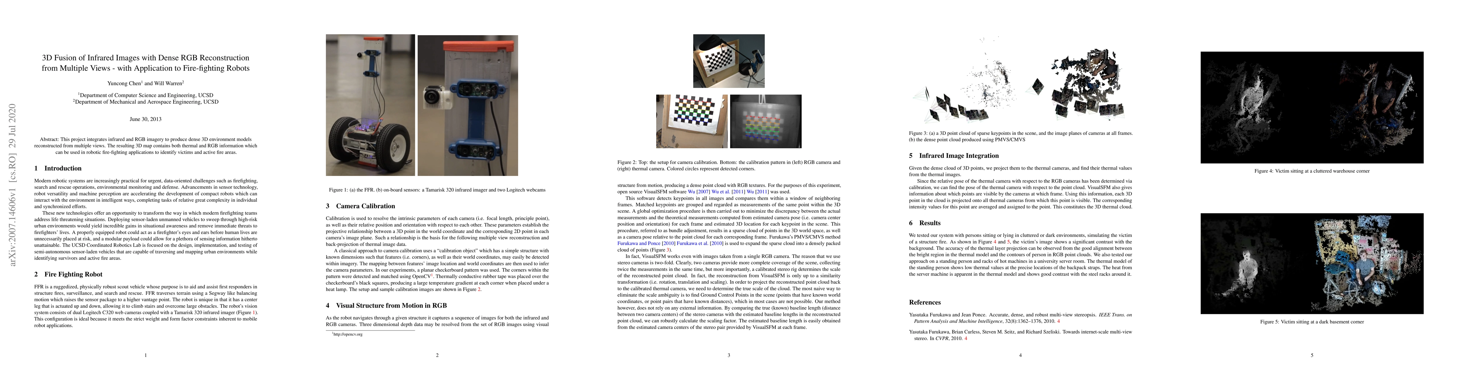 This research fuses infrared and RGB images to create dense 3D environment models from multiple views, enhancing fire-fighting robots' ability to locate victims and active fire zones using thermal and visual data.