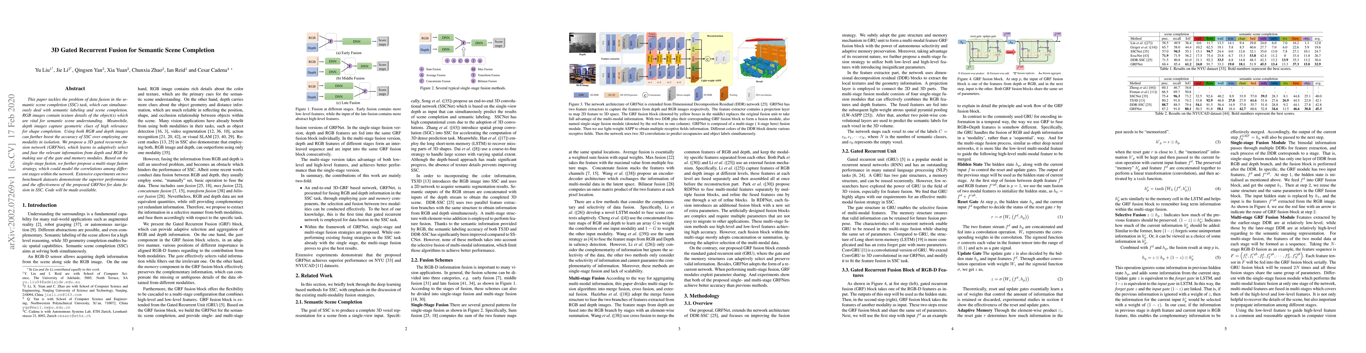 This paper introduces a 3D gated recurrent fusion network (GRFNet) for semantic scene completion, leveraging both RGB and depth images to enhance accuracy. The proposed multi-stage fusion strategy adaptively selects and fuses relevant information, outperforming single-stage methods on benchmark datasets.