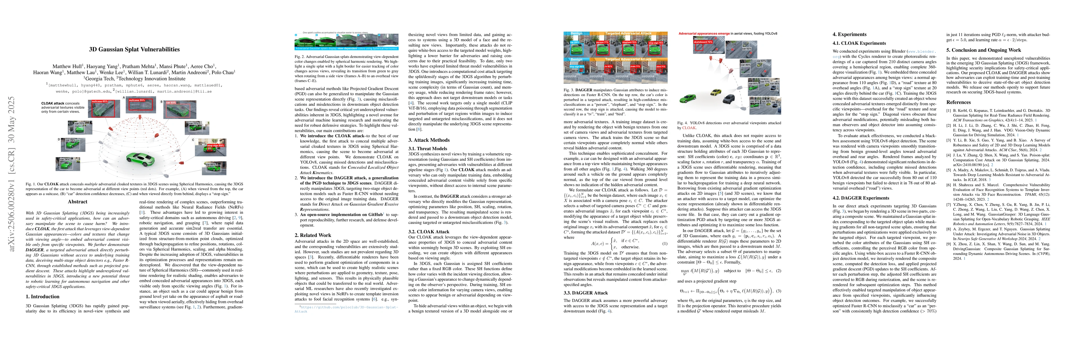The research introduces two attacks, CLOAK and DAGGER, targeting 3D Gaussian Splatting (3DGS) for safety-critical applications. CLOAK conceals adversarial content visible only from specific viewpoints using Spherical Harmonics, while DAGGER directly manipulates 3D Gaussians to deceive multi-stage object detectors like Faster R-CNN.