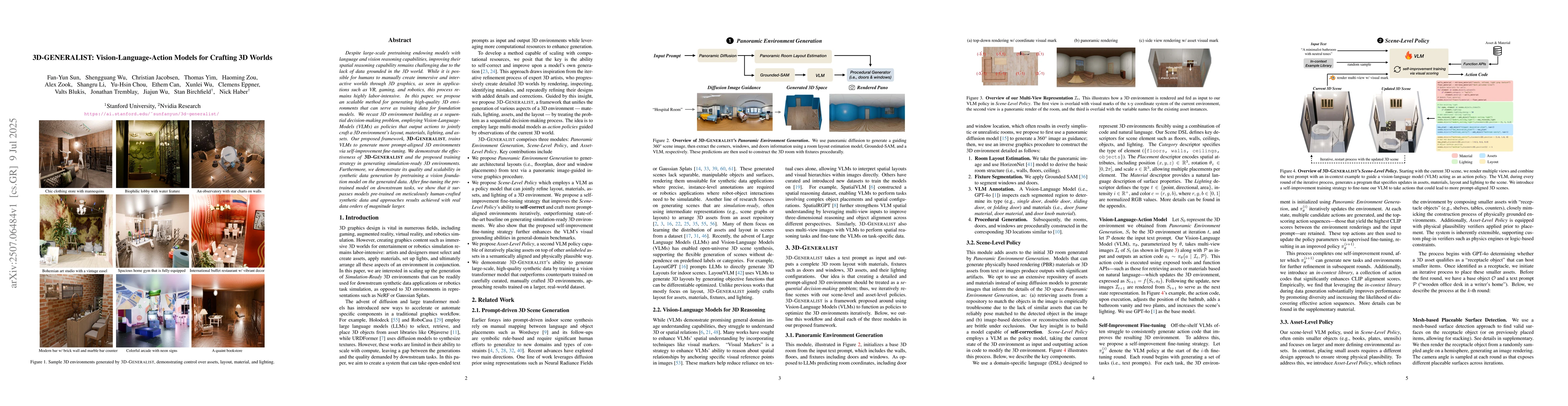 Despite large-scale pretraining endowing models with language and vision reasoning capabilities, improving their spatial reasoning capability remains challenging due to the lack of data grounded in the 3D world. While it is possible for humans to manually create immersive and interactive worlds through 3D graphics, as seen in applications such as VR, gaming, and robotics, this process remains highly labor-intensive. In this paper, we propose a scalable method for generating high-quality 3D environments that can serve as training data for foundation models. We recast 3D environment building as a sequential decision-making problem, employing Vision-Language-Models (VLMs) as policies that output actions to jointly craft a 3D environment's layout, materials, lighting, and assets. Our proposed framework, 3D-Generalist, trains VLMs to generate more prompt-aligned 3D environments via self-improvement fine-tuning. We demonstrate the effectiveness of 3D-Generalist and the proposed training strategy in generating simulation-ready 3D environments. Furthermore, we demonstrate its quality and scalability in synthetic data generation by pretraining a vision foundation model on the generated data. After fine-tuning the pre-trained model on downstream tasks, we show that it surpasses models pre-trained on meticulously human-crafted synthetic data and approaches results achieved with real data orders of magnitude larger.