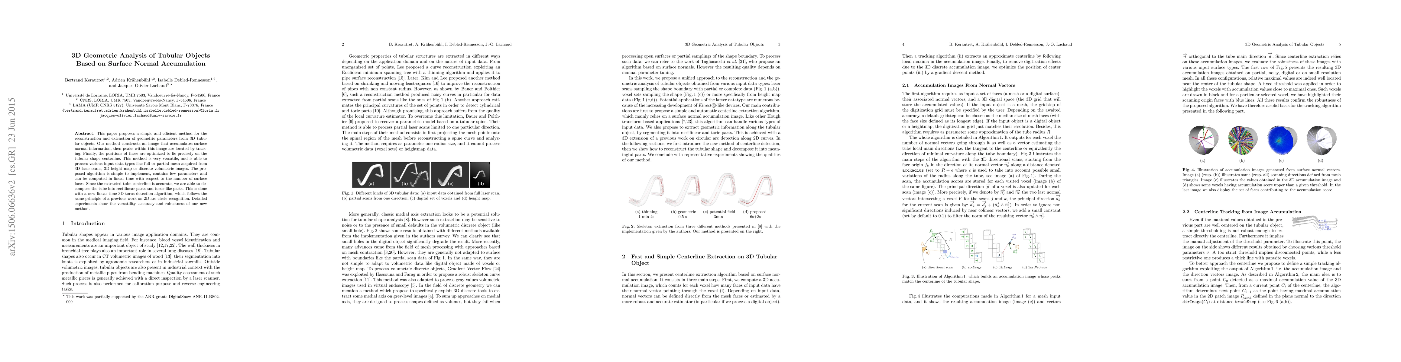 This paper proposes a simple and efficient method for the reconstruction and extraction of geometric parameters from 3D tubular objects. Our method constructs an image that accumulates surface normal information, then peaks within this image are located by tracking. Finally, the positions of these are optimized to lie precisely on the tubular shape centerline. This method is very versatile, and is able to process various input data types like full or partial mesh acquired from 3D laser scans, 3D height map or discrete volumetric images. The proposed algorithm is simple to implement, contains few parameters and can be computed in linear time with respect to the number of surface faces. Since the extracted tube centerline is accurate, we are able to decompose the tube into rectilinear parts and torus-like parts. This is done with a new linear time 3D torus detection algorithm, which follows the same principle of a previous work on 2D arc circle recognition. Detailed experiments show the versatility, accuracy and robustness of our new method.