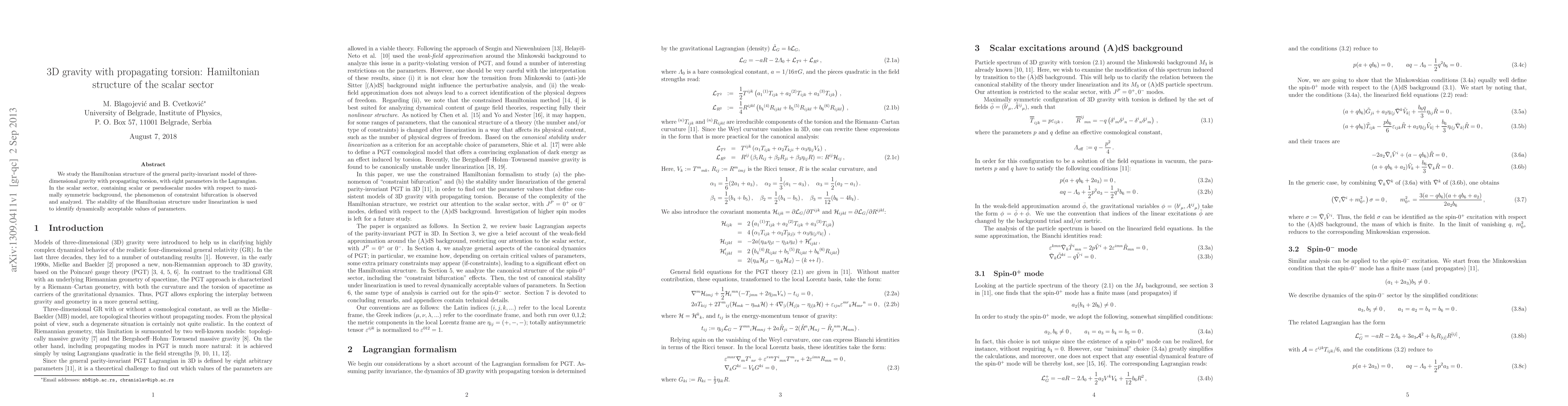 This paper investigates the Hamiltonian structure of a parity-invariant 3D gravity model with torsion, focusing on the scalar sector. It identifies constraint bifurcation phenomena and uses parameter stability under linearization to determine acceptable values for the model's eight parameters.