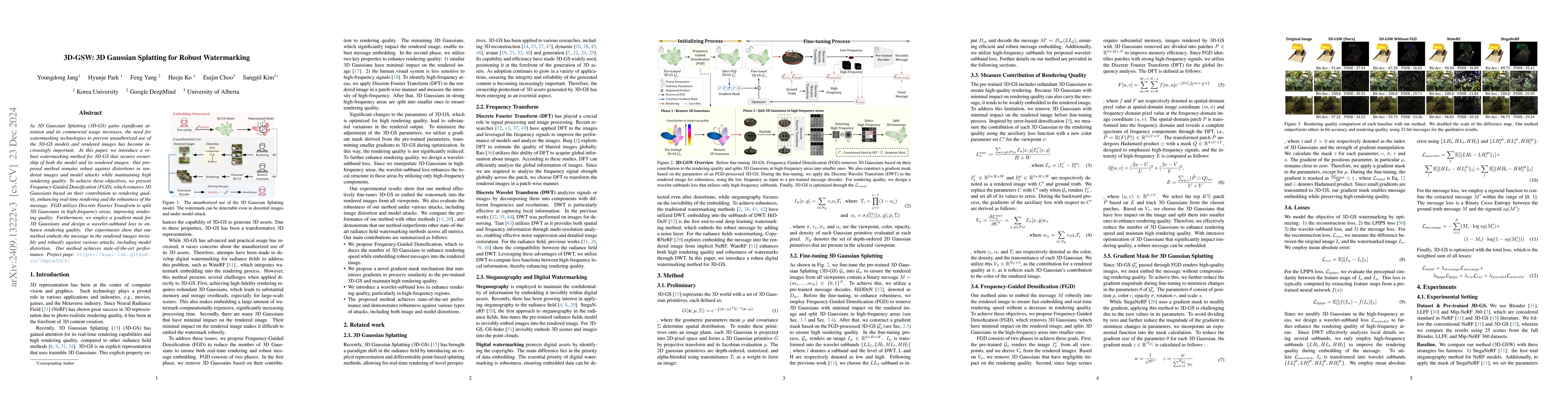 This paper introduces a novel watermarking method called 3D Gaussian Splatting Watermark (3D-GSW) for protecting copyrights in 3D Gaussian splatting radiance fields. The method embeds binary messages into 3D Gaussians using Frequency-Guided Densification and an adaptive gradient mask to enhance rendering quality while maintaining imperceptibility, capacity, and robustness.