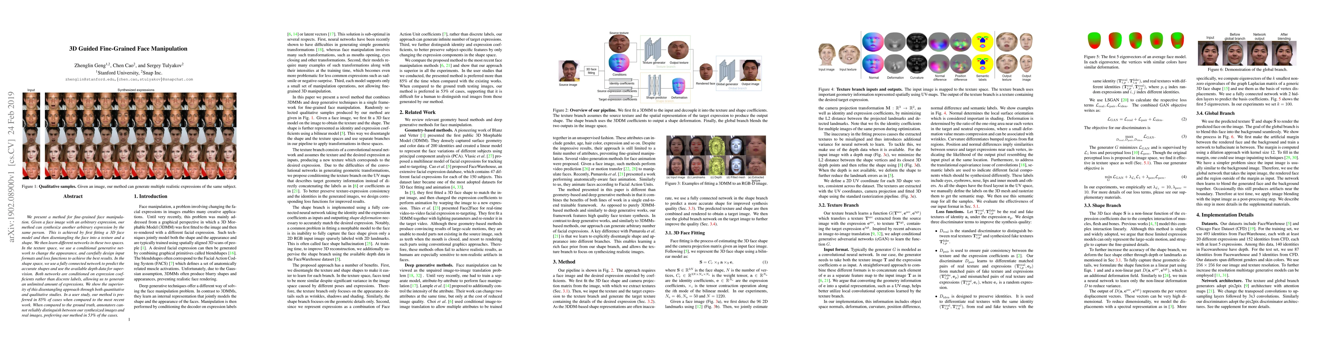 We present a method for fine-grained face manipulation. Given a face image with an arbitrary expression, our method can synthesize another arbitrary expression by the same person. This is achieved by first fitting a 3D face model and then disentangling the face into a texture and a shape. We then learn different networks in these two spaces. In the texture space, we use a conditional generative network to change the appearance, and carefully design input formats and loss functions to achieve the best results. In the shape space, we use a fully connected network to predict the accurate shapes and use the available depth data for supervision. Both networks are conditioned on expression coefficients rather than discrete labels, allowing us to generate an unlimited amount of expressions. We show the superiority of this disentangling approach through both quantitative and qualitative studies. In a user study, our method is preferred in 85% of cases when compared to the most recent work. When compared to the ground truth, annotators cannot reliably distinguish between our synthesized images and real images, preferring our method in 53% of the cases.